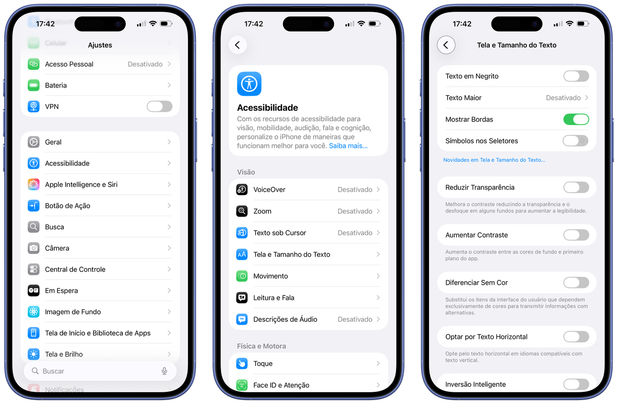 Abra os Ajustes (Settings) e toque em “Acessibilidade”. Acesse “Tela e Tamanho do Texto” (na seção Visão) e marque a opção “Mostrar Bordas”.