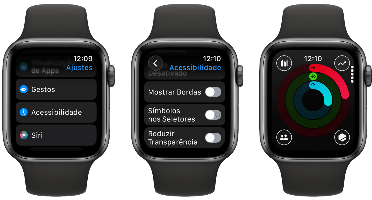 É possível fazer a mesma coisa também usando o iPhone, abrindo o app Watch, tocando em “Acessibilidade” e habilitando “Mostrar Bordas”.