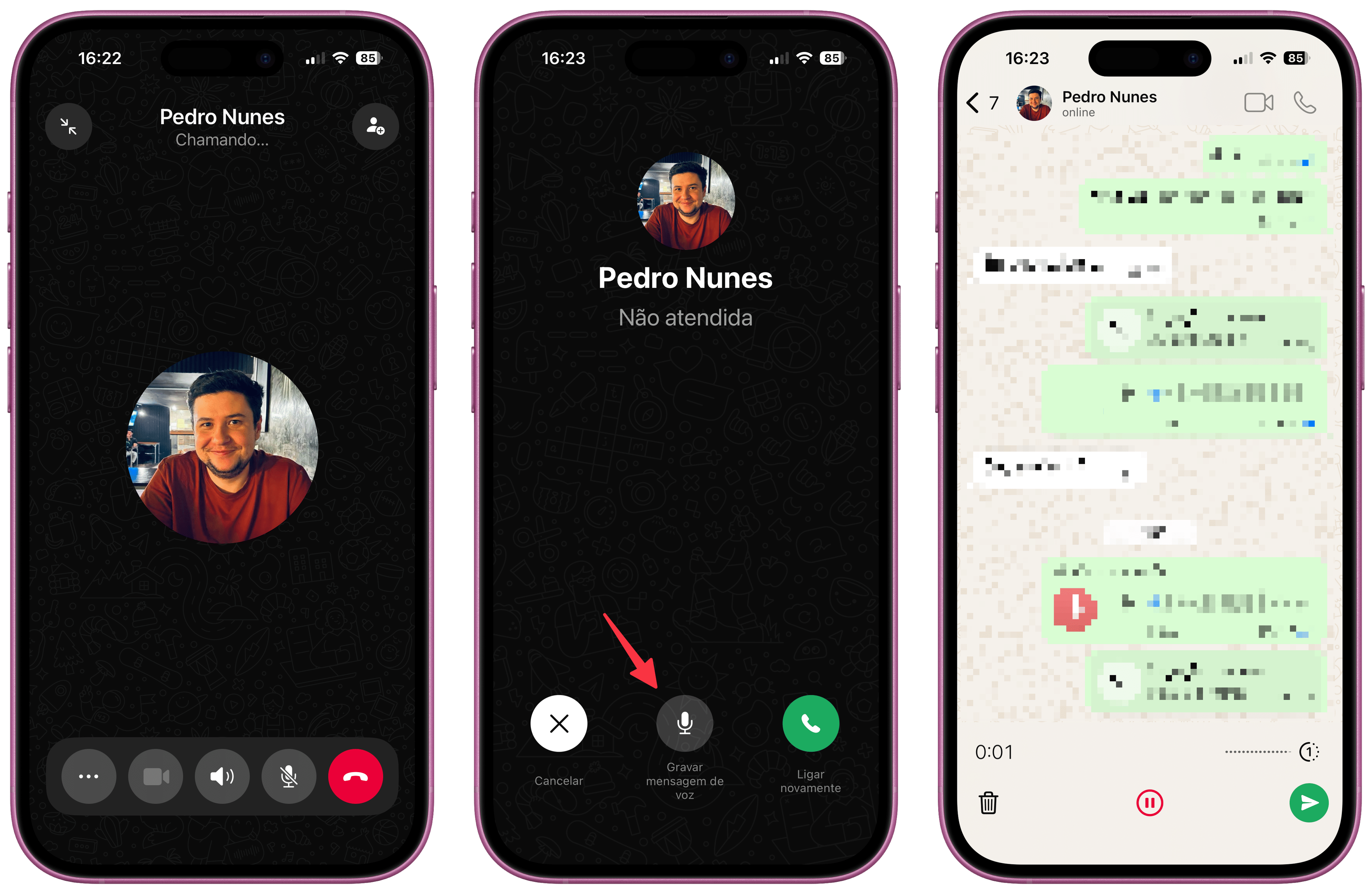 Luiz Gustavo Ribeiro11/12/2025 • 16:28Caso a pessoa não atenda uma chamada feita do mensageiro, toque em “Gravar mensagem de voz” ou “Gravar recado de vídeo”, no seu iPhone ou iPad, para começar a gravar.
