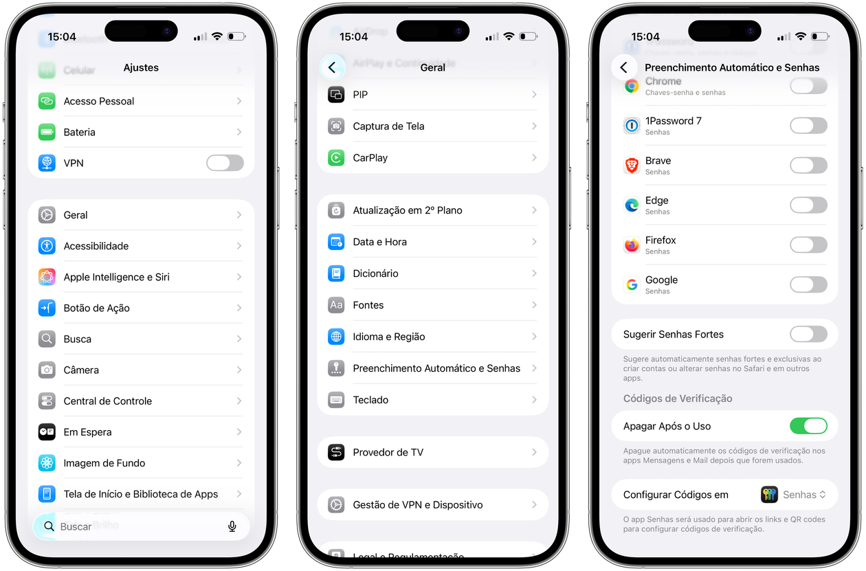 Abra os Ajustes (Settings), selecione “Geral” e “Preenchimento Automático e Senhas” para desmarcar “Sugerir Senhas Fortes”.