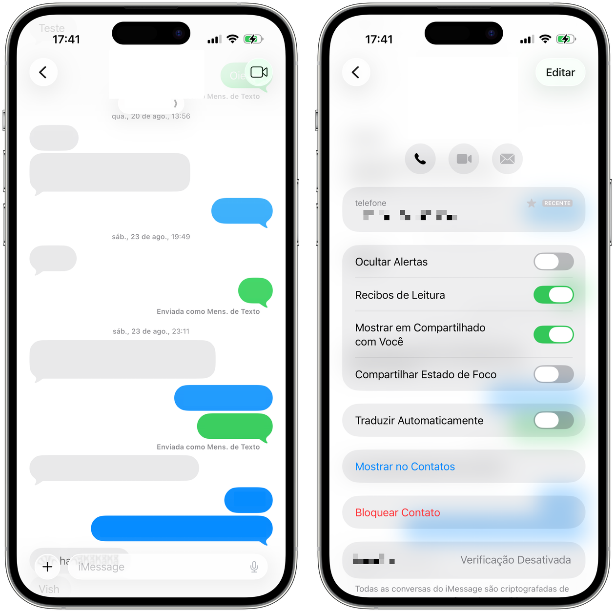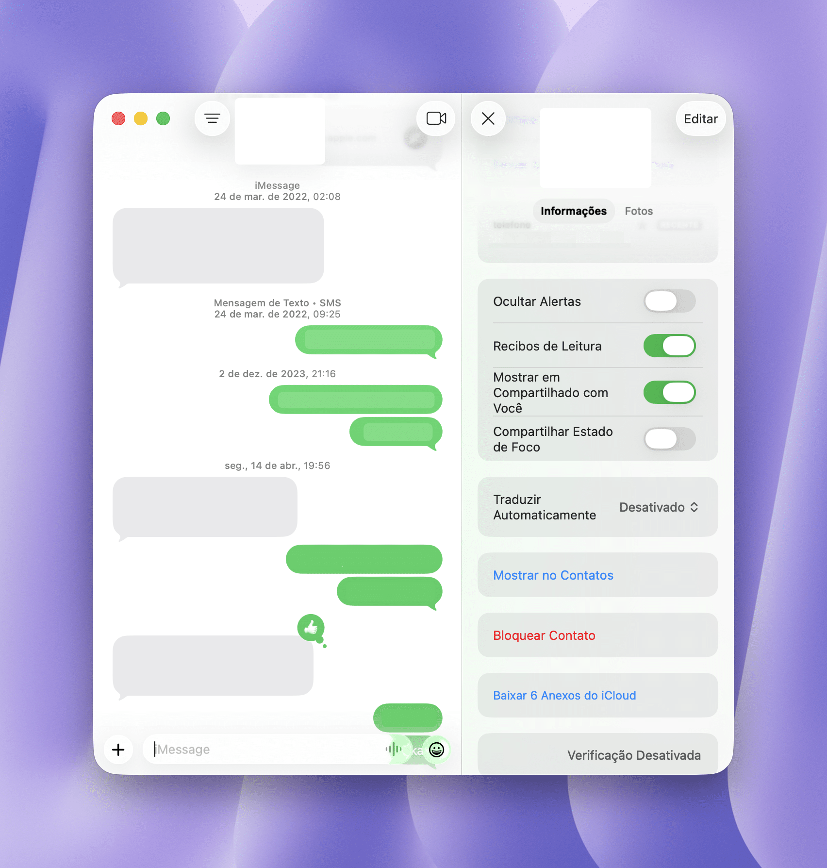 Selecione a conversa no app Mensagens, clique no nome do contato e vá até Conversa
