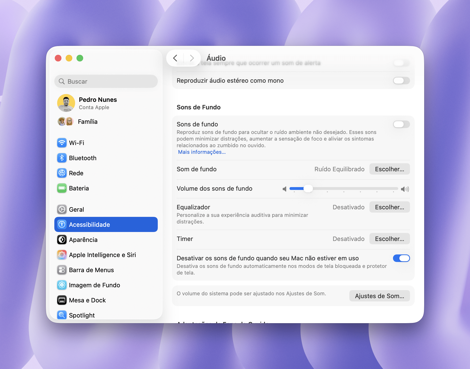 Por fim, marque a opção “Desativar os sons de fundo quando seu Mac não estiver em uso”.