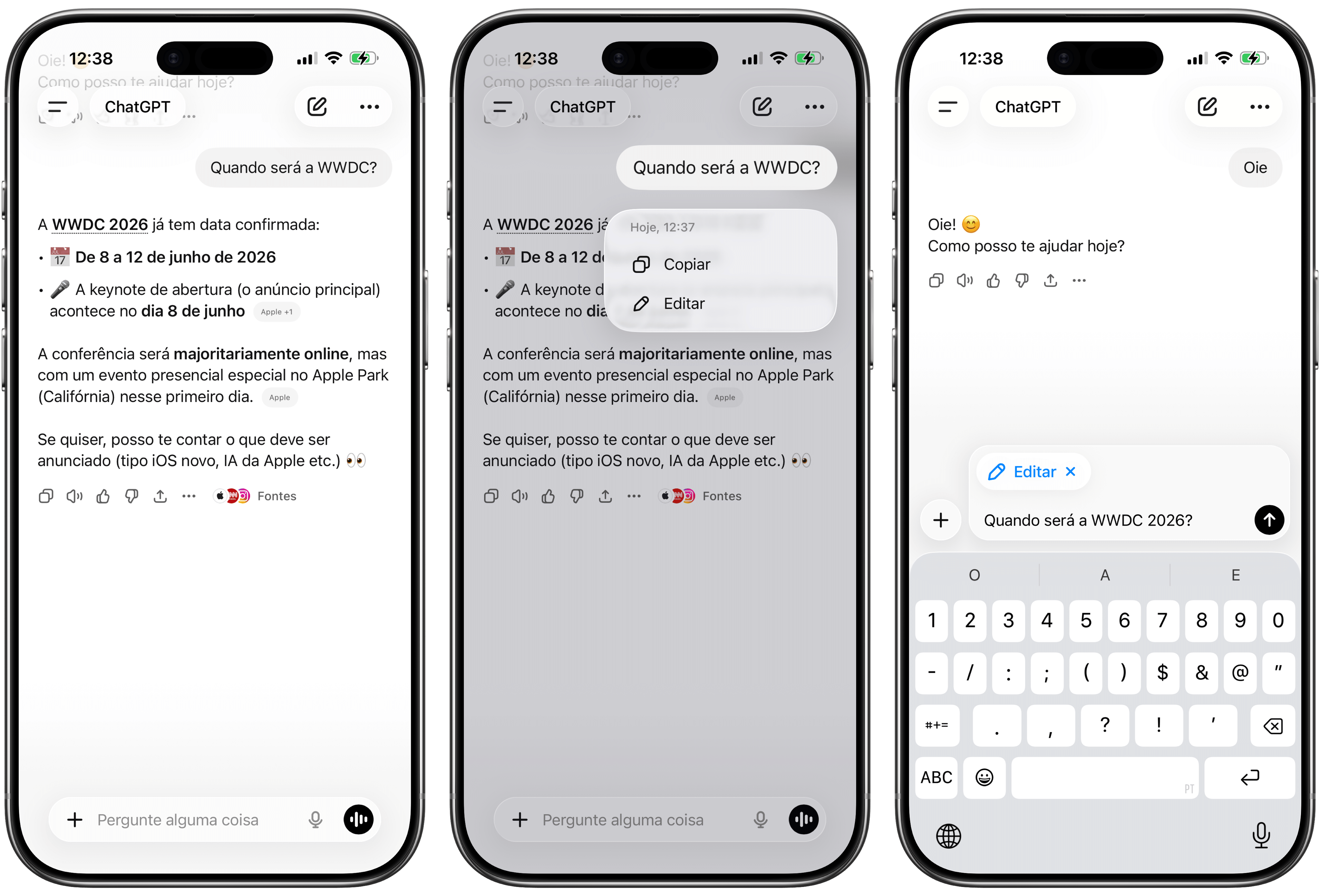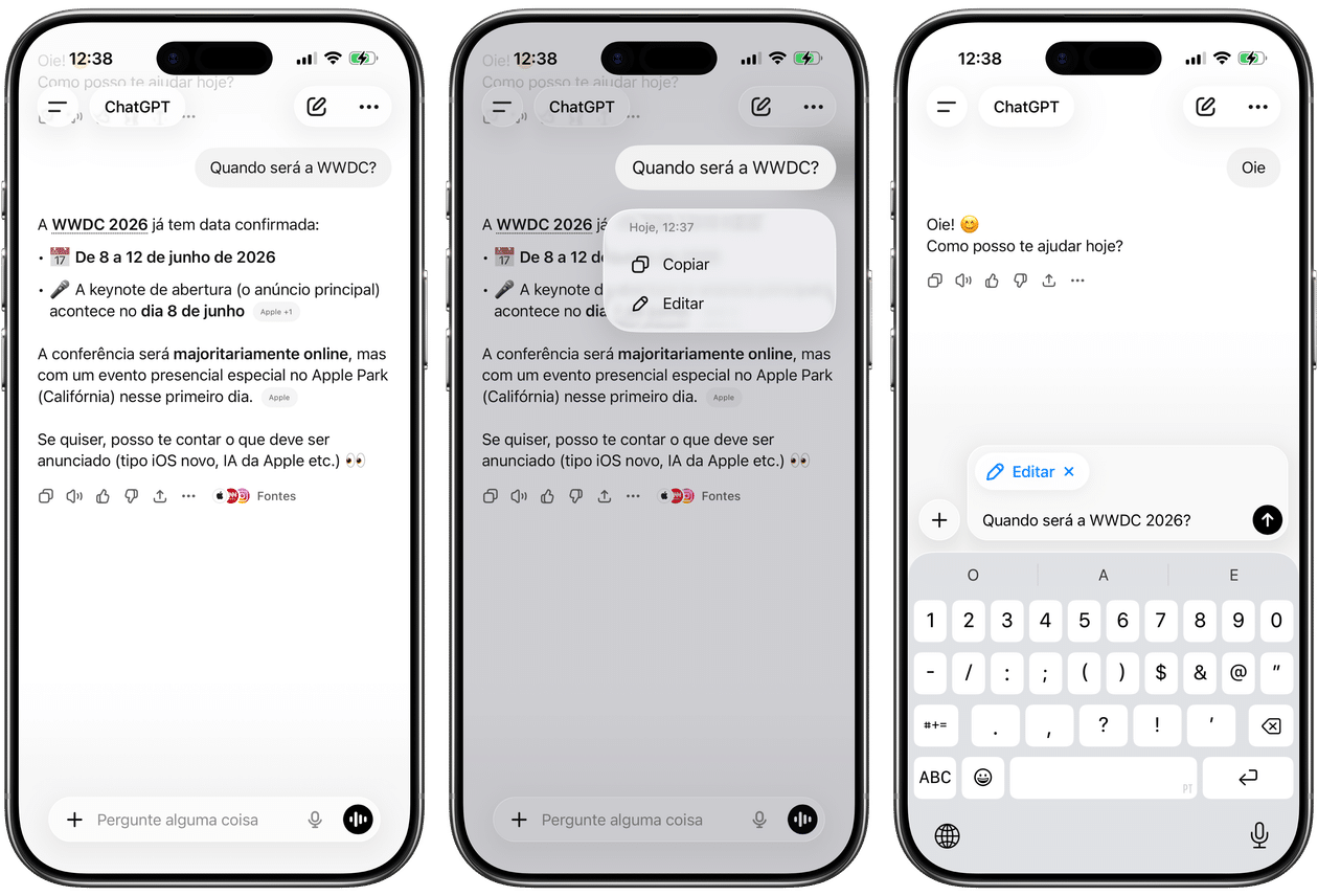 Primeiro, abra o app do ChatGPT no seu iPhone, iPad ou Mac. No iOS/iPadOS, mantenha o toque em cima do texto que deseja editar e selecione “Editar”; no macOS, passe o cursor em cima da mensagem e clique em cima do ícone representado por um lápis.