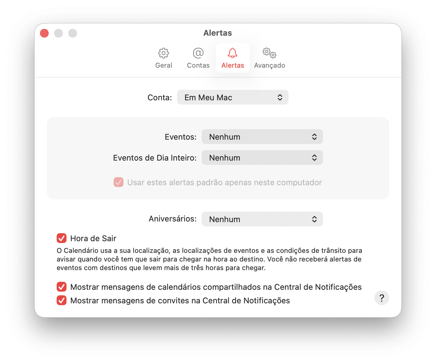 Clique na aba “Alertas” e marque a caixa localizada ao lado de “Mostrar mensagens de calendários compartilhados na Central de Notificações”.