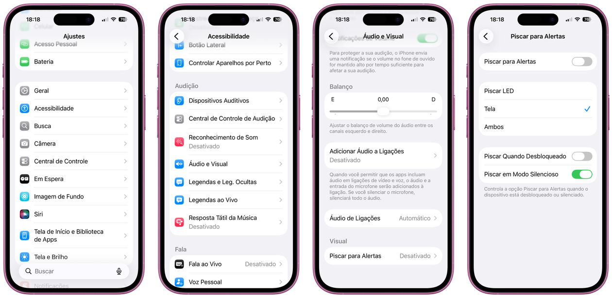 Você ainda tem a opção de marcar “Tela” ou “Ambos”, caso queira que tanto a tela quanto o flash LED pisquem juntos.