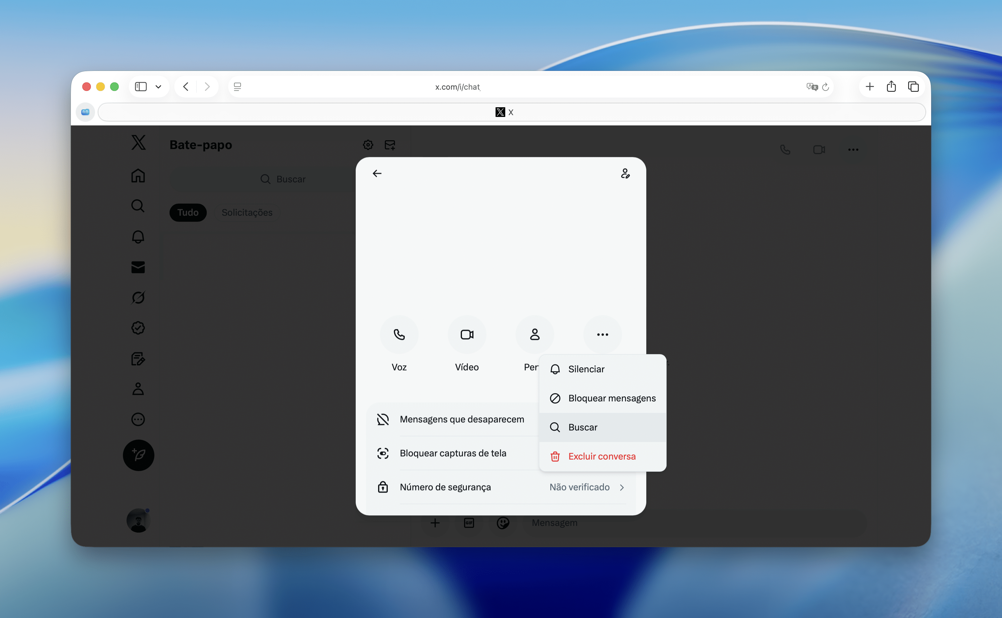 Com a sua conta do X logada, abra a área de mensagens, clique na conversa, nos três pontinhos e vá em “Mais” para que a opção de busca apareça.