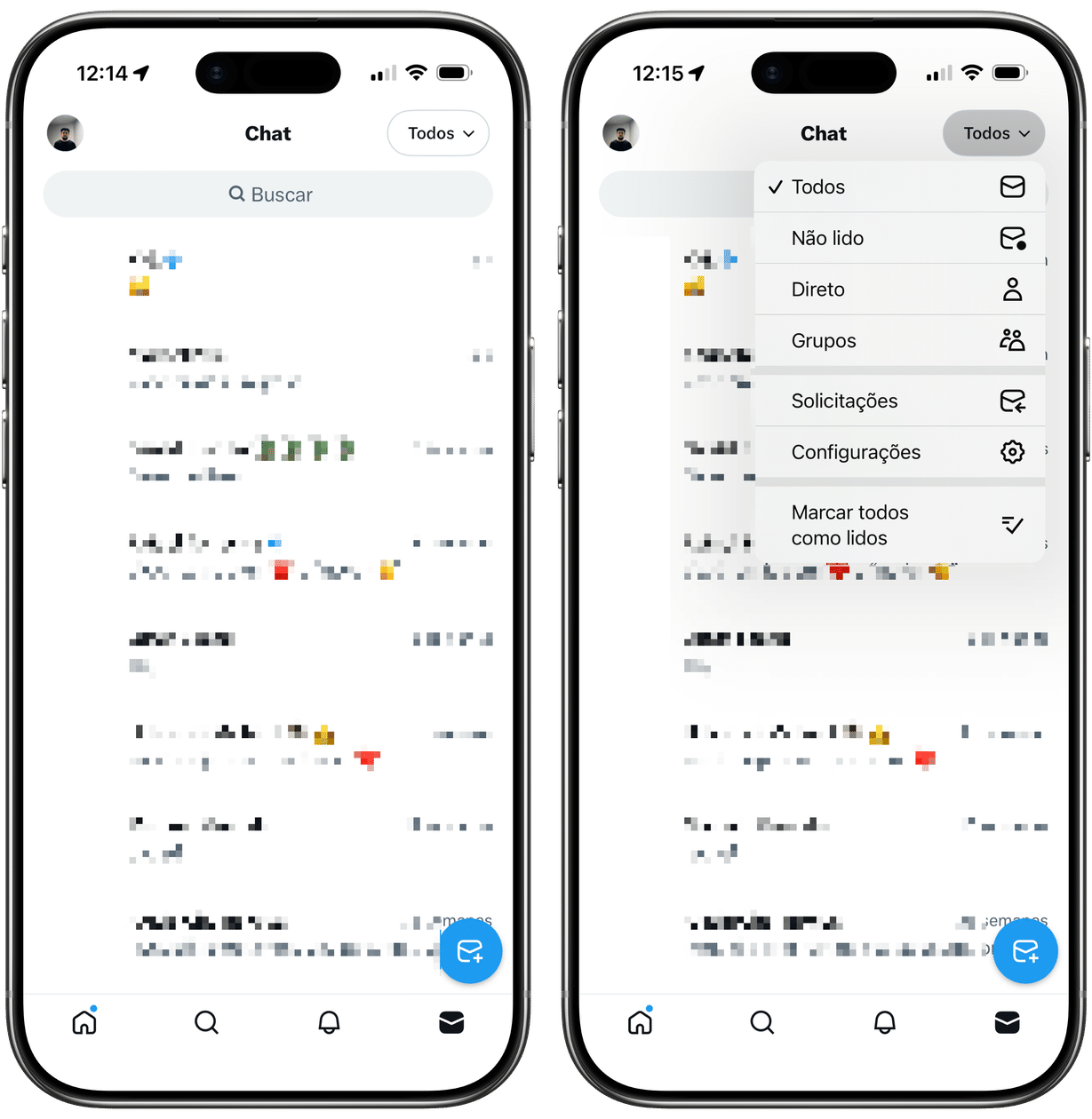 Pedro Henrique Nunes25/02/2026 • 08:00Com o app aberto no seu iPhone ou iPad, toque na aba de mensagens (no canto inferior direito). Selecione “Todos”, no canto superior direito, para abrir o menu suspenso com os filtros disponíveis: