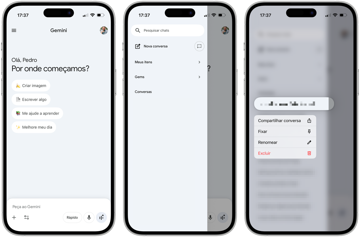 Luiz Gustavo Ribeiro12/01/2026 • 12:44- Com o app ou o site do Gemini aberto no seu aparelho, abra o menu lateral com o seu histórico de conversas, clicando/tocando nos três risquinhos.