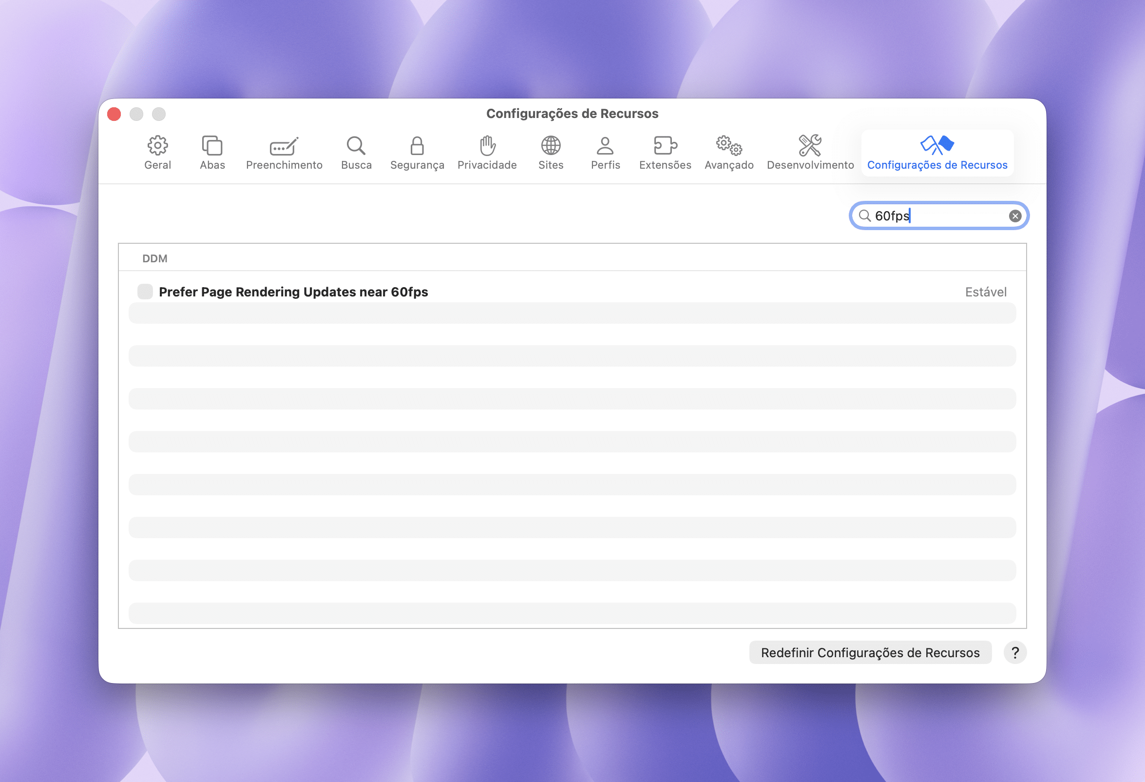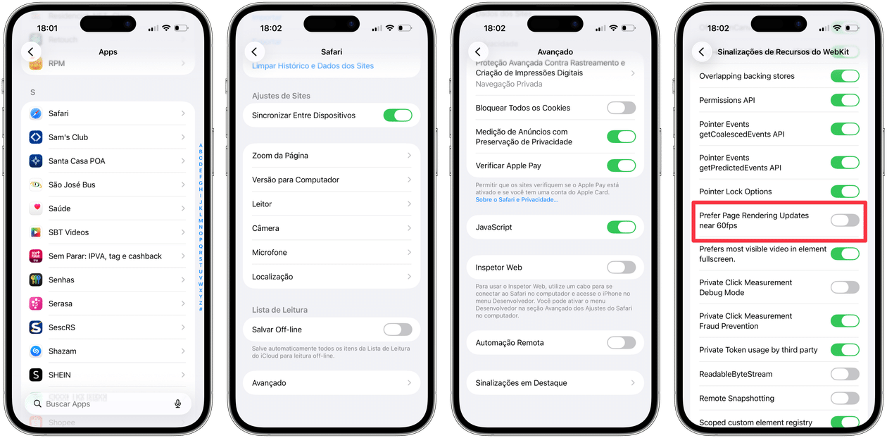 Selecione a nova aba que aparecerá na direita, “Configurações de Recursos”, e busque por “60fps”. Desmarque “Prefer Page Rendering Updates near 60fps” e reinicie o Safari para ver o resultado na prática.