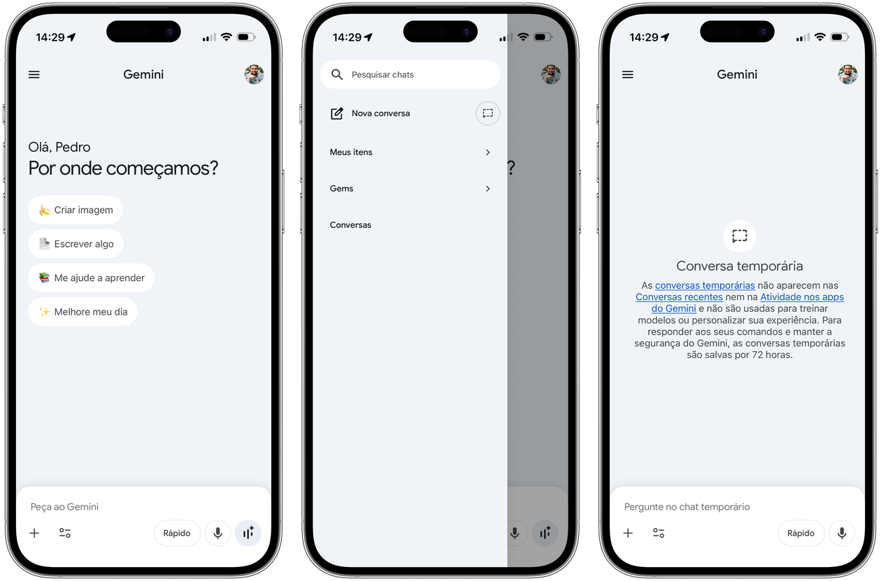 De acordo com o Google, essas conversas não aparecerão em seus chats recentes ou na atividade nos apps do Gemini, além de não serem usadas para personalizar a experiência ou treinar os modelos de IA da empresa. Os chats temporários são mantidos por até 72 horas.