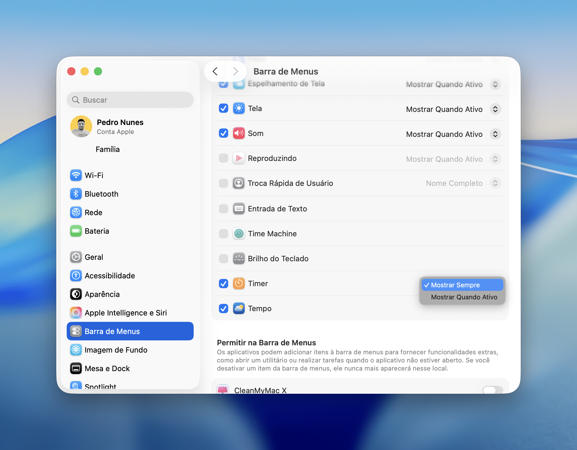 Pedro Henrique Nunes28/11/2022 • 07:00Abra os Ajustes do Sistema (System Settings) e clique em “Barra de Menus”, na barra lateral esquerda. Em seguida, marque a chave ao lado de “Timers” e use o menu suspenso ao lado dele para escolher “Mostrar Sempre”.