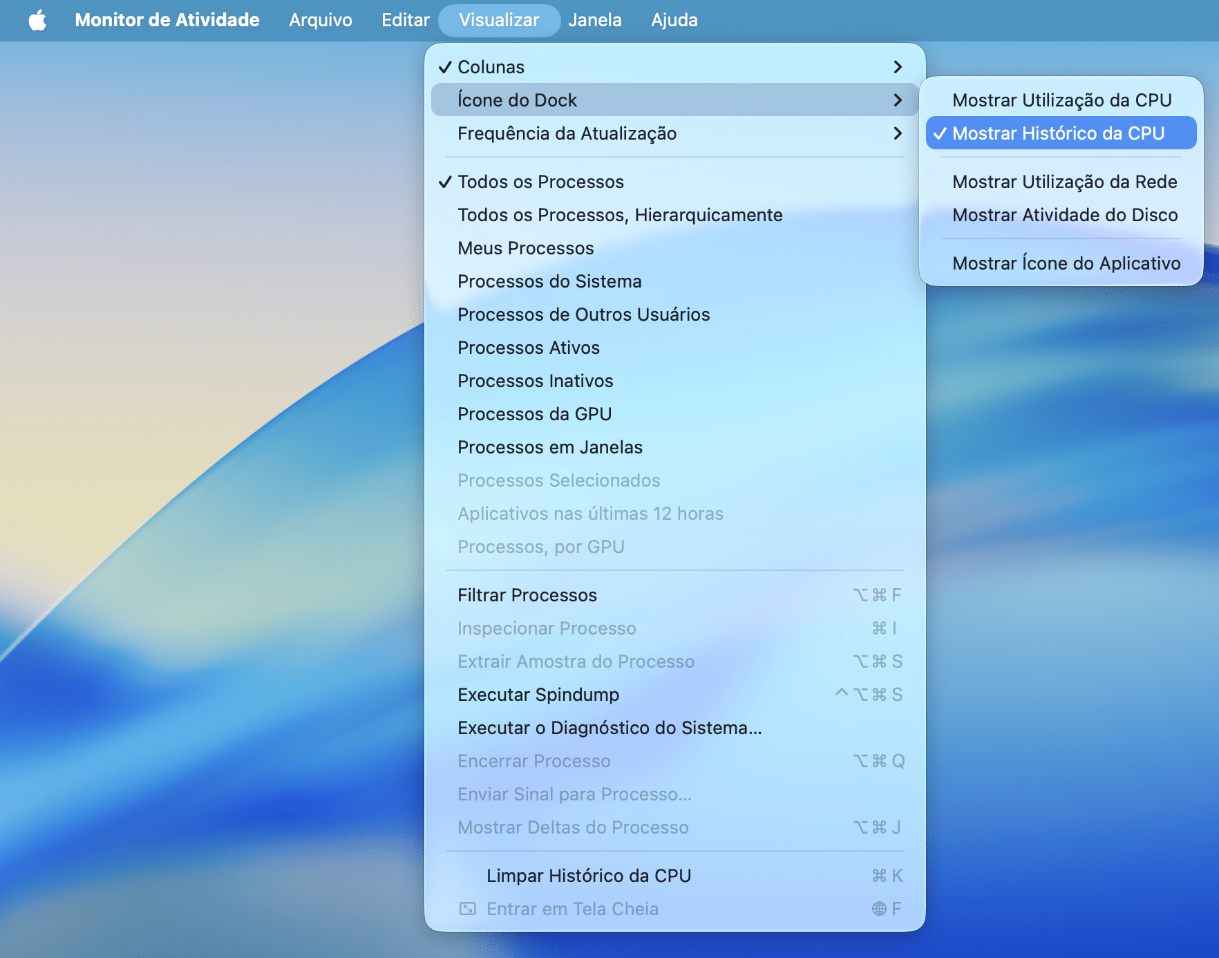 Com o app Monitor de Atividade aberto, clique em Visualizar » Ícone do Dock, na barra de menus. Ou, se preferir, clique com o botão direito do mouse em cima do ícone no Dock e escolha “Ícone do Dock”.