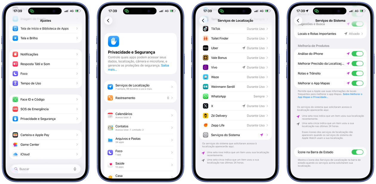 Abra os Ajustes (Settings) e vá até Privacidade e Segurança » Serviços de Localização » Serviços do Sistema e ative a opção “Ícone na Barra de Estado”.