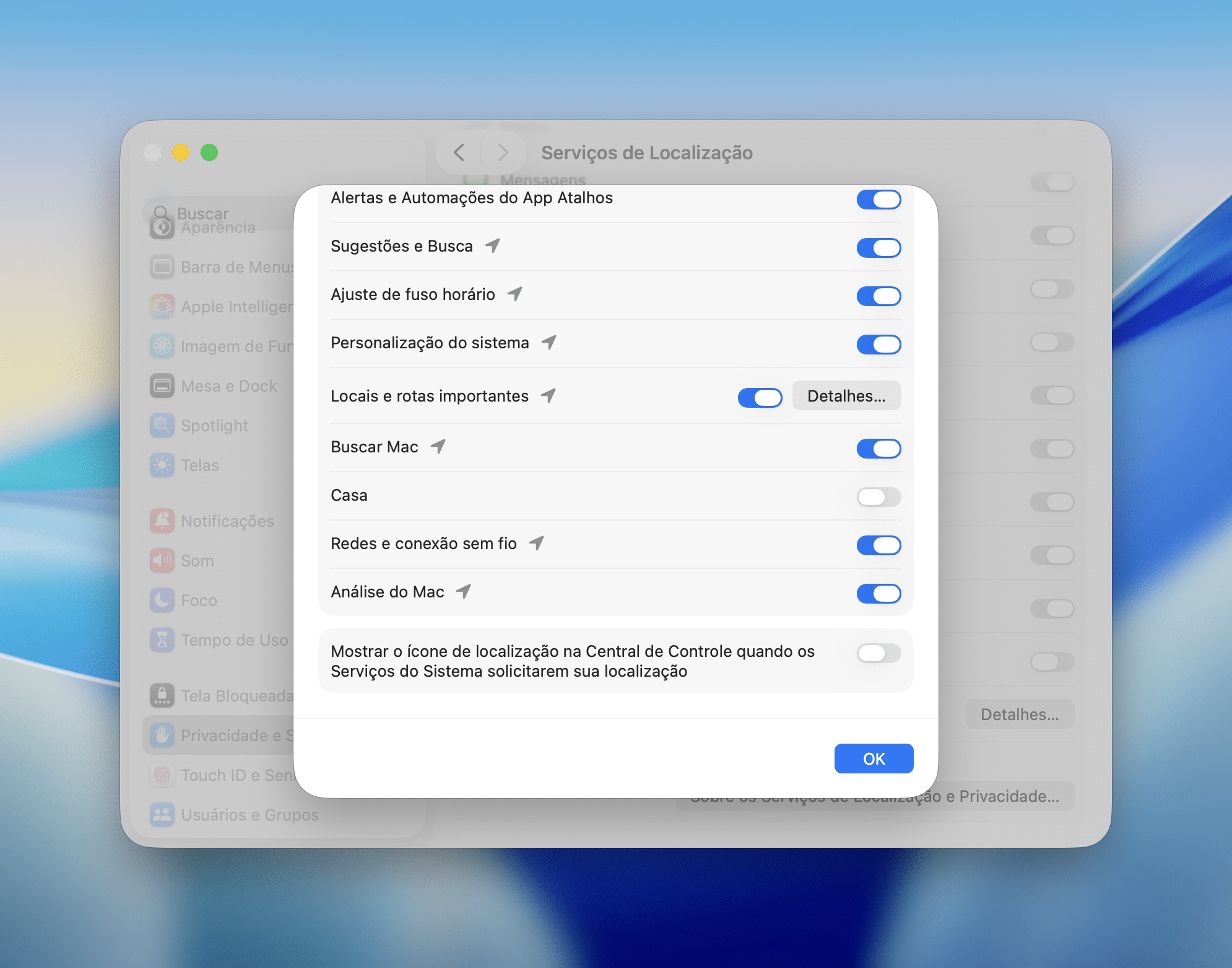 Clique em “Detalhes…”, ao lado de “Serviços do Sistema” e habilite “Mostrar o ícone de localização na Central de Controle quando os Serviços do Sistema solicitarem sua localização”.