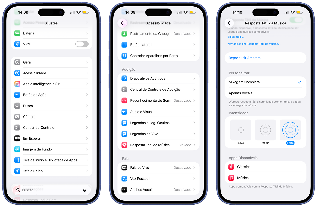 Recentemente, a Maçã trouxe algumas melhorias para essa função, como a possibilidade de escolher a intensidade do tato. Ela pode ser “Leve”, “Média” ou “Forte”, e é possível escolher a que você mais curte de um jeito bem simples, Veja como! 🎶