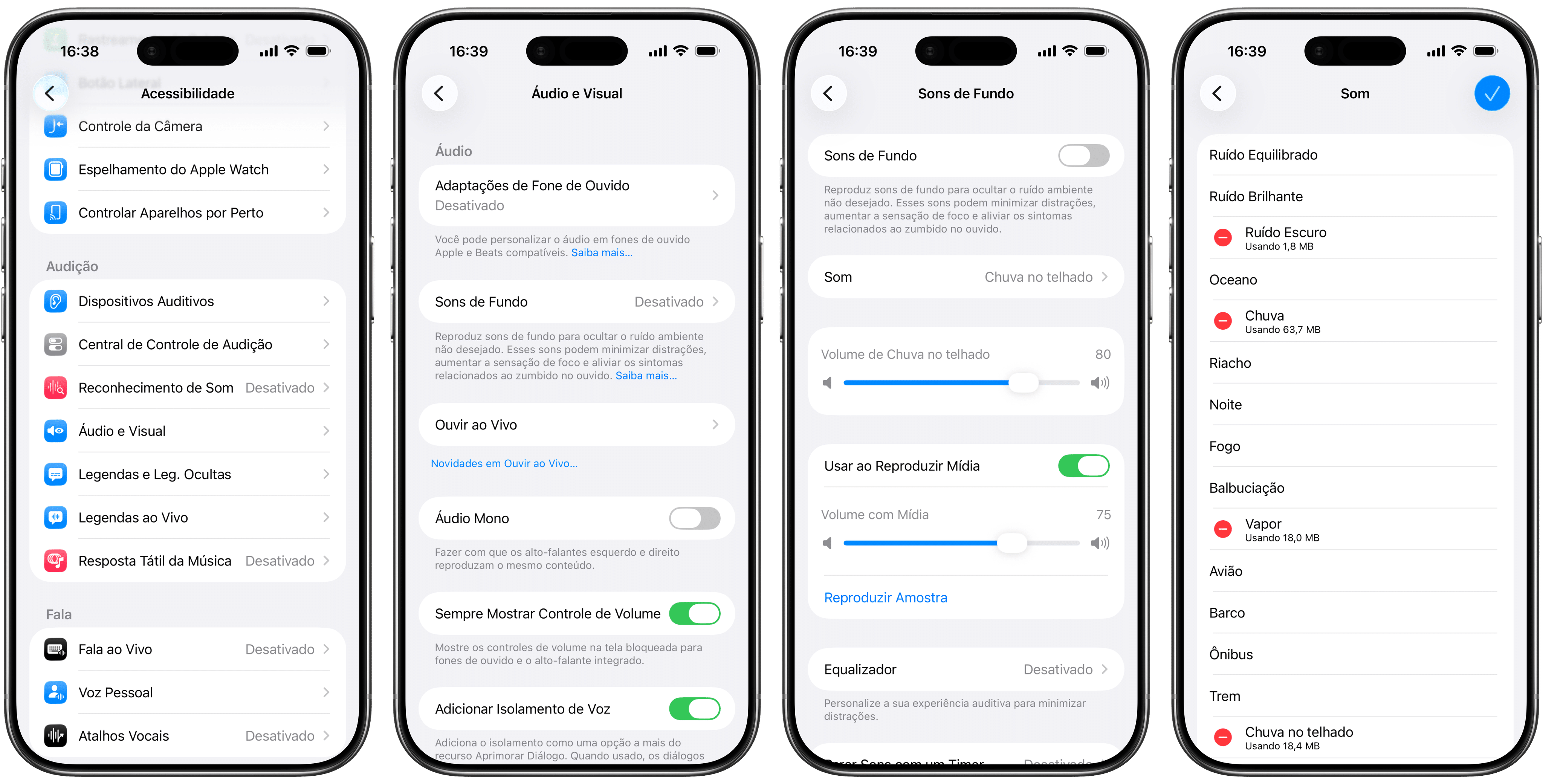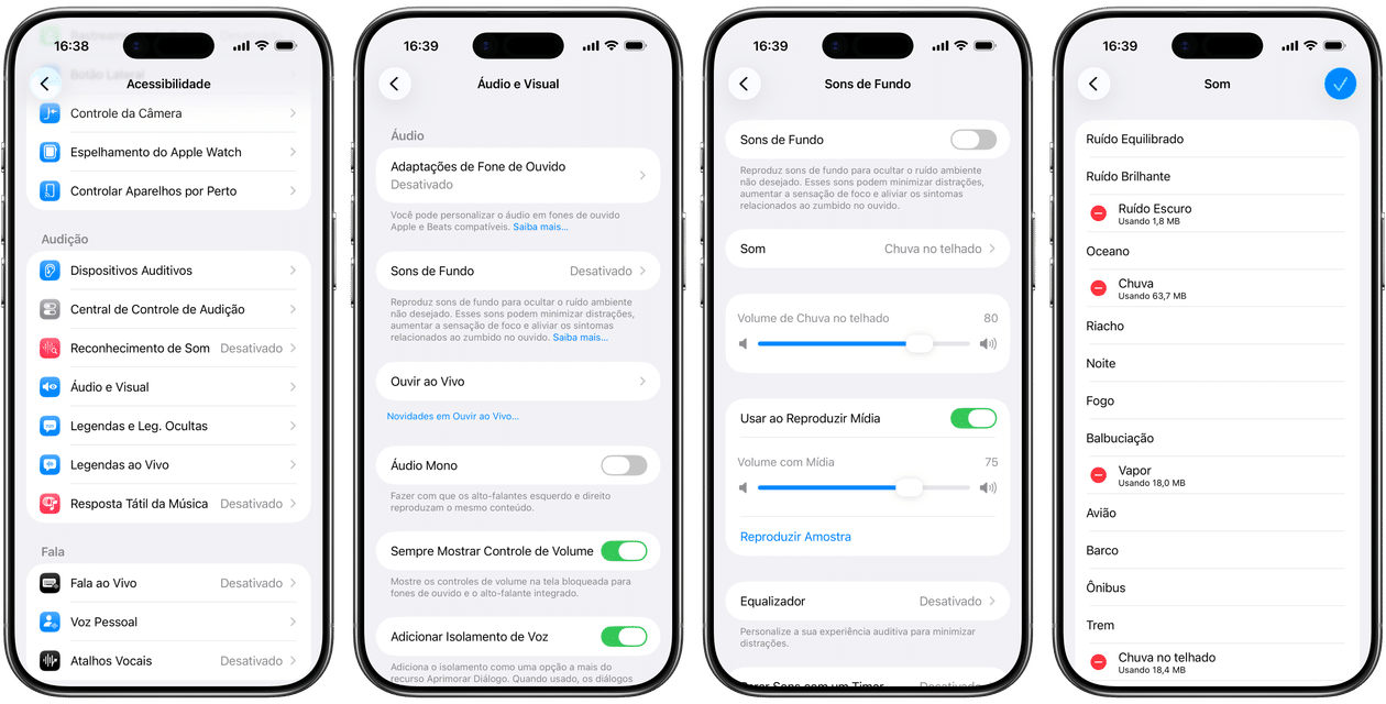 Pedro Henrique Nunes15/01/2026 • 07:30Abra os Ajustes (Settings) e toque em “Acessibilidade”. Depois, acesse “Áudio e Visual” e vá em “Sons de Fundo”.