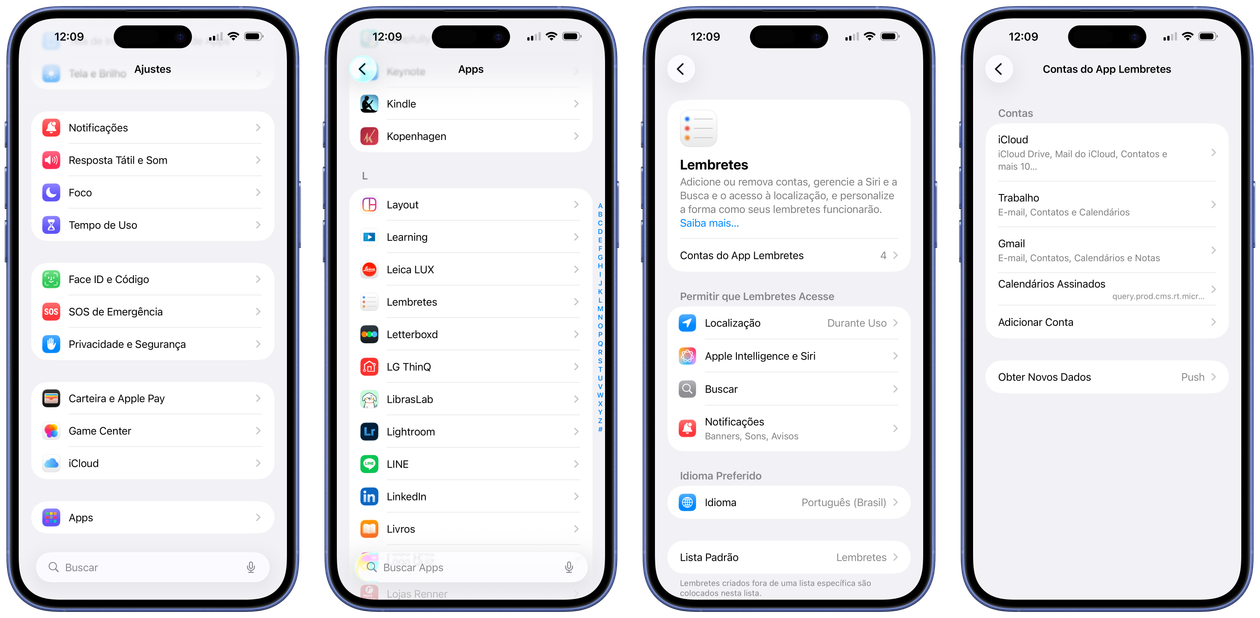 O aplicativo Lembretes (Reminders) permite que você use múltiplas contas, como do iCloud e do Google, por exemplo. Assim, você mantém as suas listas de tarefas em um único local, porém organizadas — mesmo usando mais de uma conta no seu iPhone, iPad e Mac.