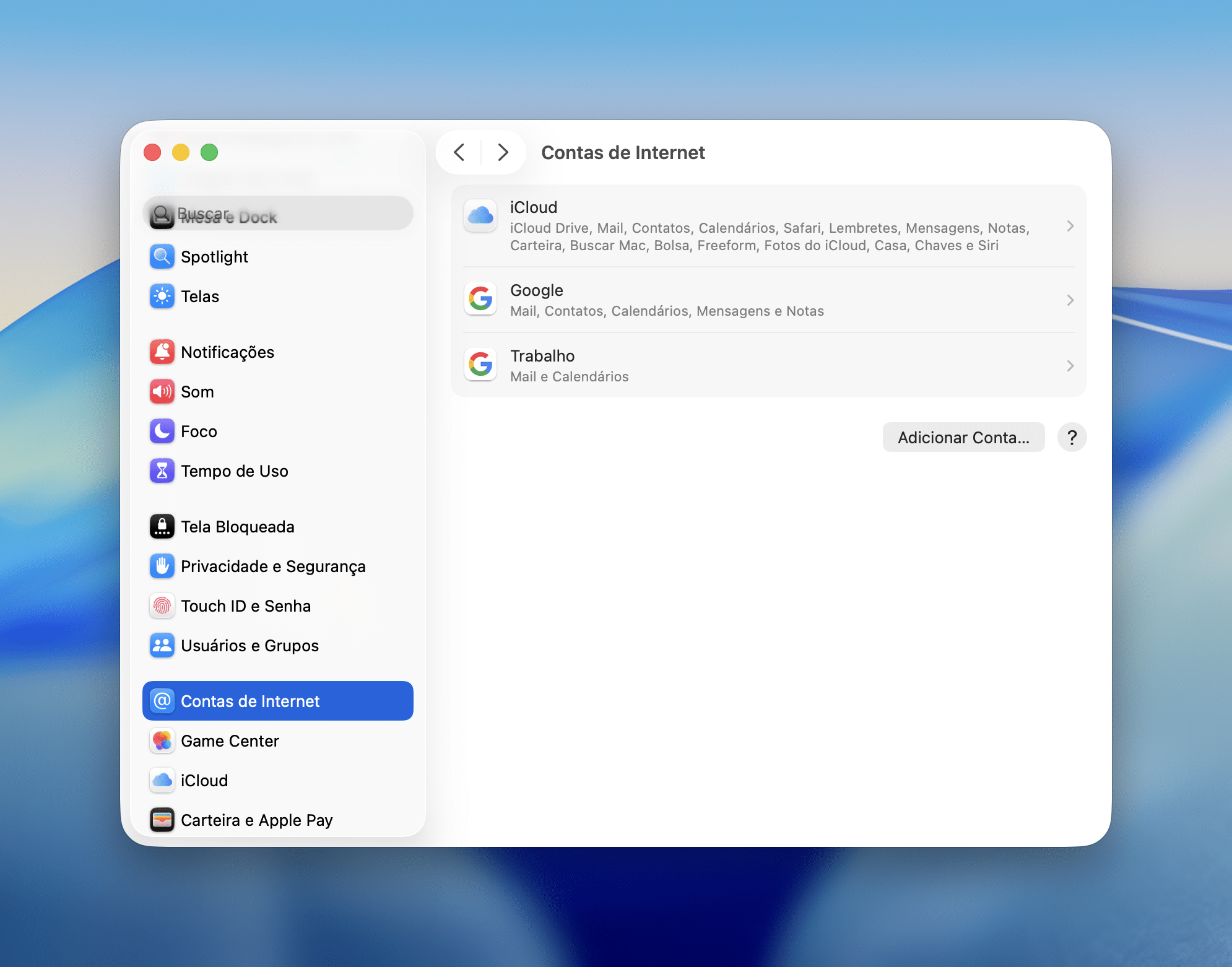 Abra os Ajustes do Sistema (System Settings) e clique em “Contas de Internet”, na barra lateral esquerda.