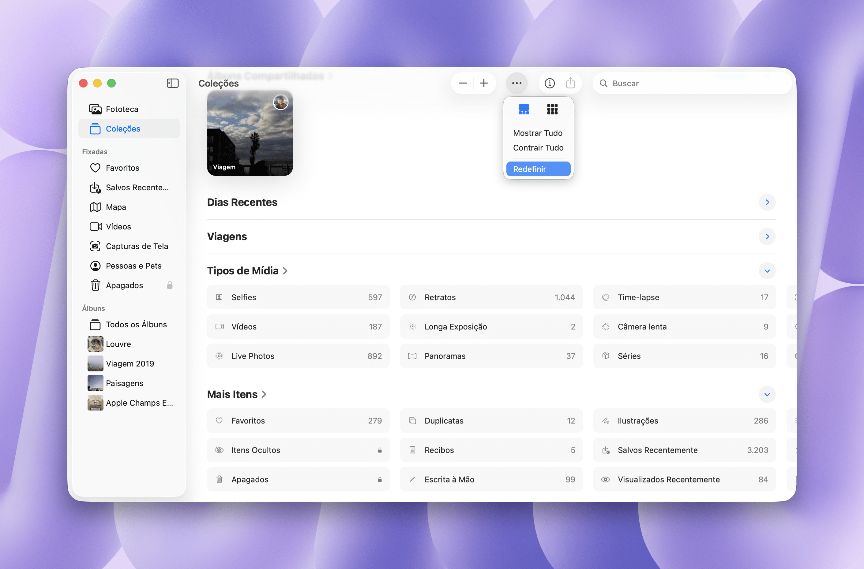 Pedro Henrique Nunes26/10/2024 • 13:30Com o aplicativo Fotos aberto, clique na aba “Coleções”, na barra lateral esquerda. Se preferir, vá até Visualizar » Coleções, na barra de menus, ou use o atalho ⌃ control 2.