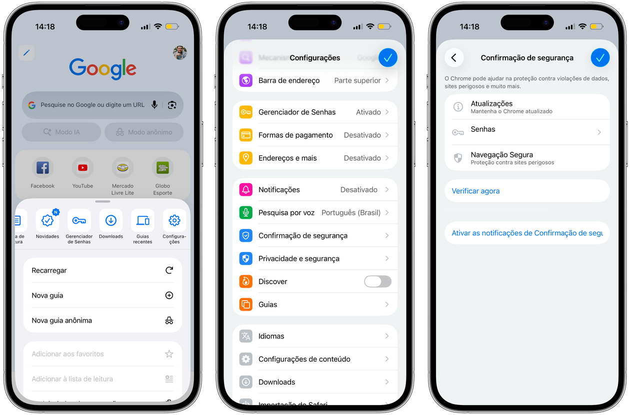 Com o Chrome aberto no seu iPhone ou iPad, toque nos três pontinhos (no canto inferior direito), selecione “Configurações” e vá em “Confirmação de segurança”.