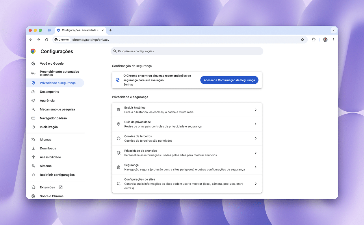 Em uma só tela, você pode verificar as atualizações pendentes, senhas comprometidas e proteções contra sites perigosos. Veja como visualizar isso! 🙂
