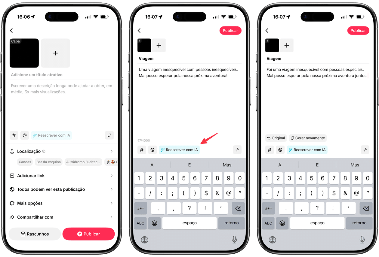 Pedro Henrique Nunes03/10/2025 • 07:30- Com o aplicativo aberto, comece fazendo uma nova publicação seguindo os primeiros passos.