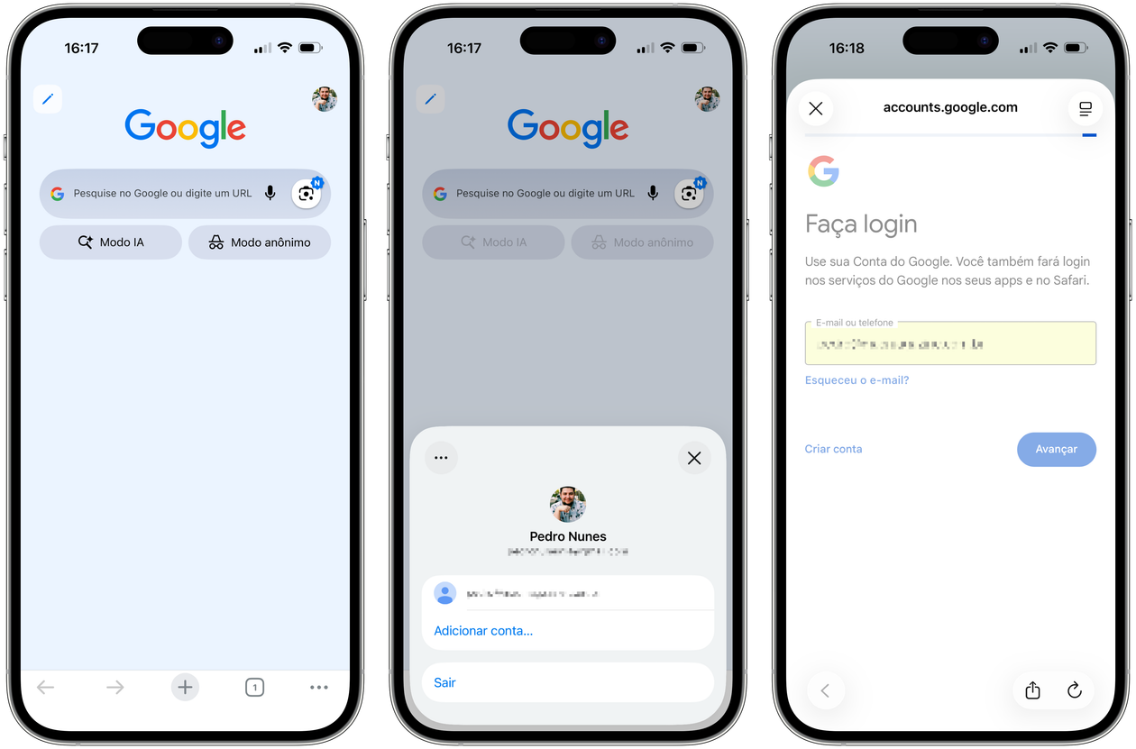 Pedro Henrique Nunes18/06/2023 • 15:00Com o Chrome aberto, toque na sua foto (no canto superior direito) e vá até “Adicionar conta…”. Siga os passos para adicionar outra Conta do Google existente ou crie uma do zero.