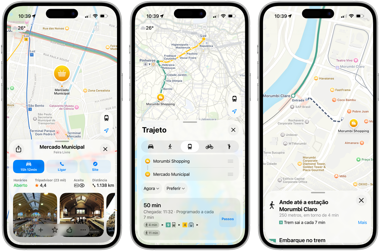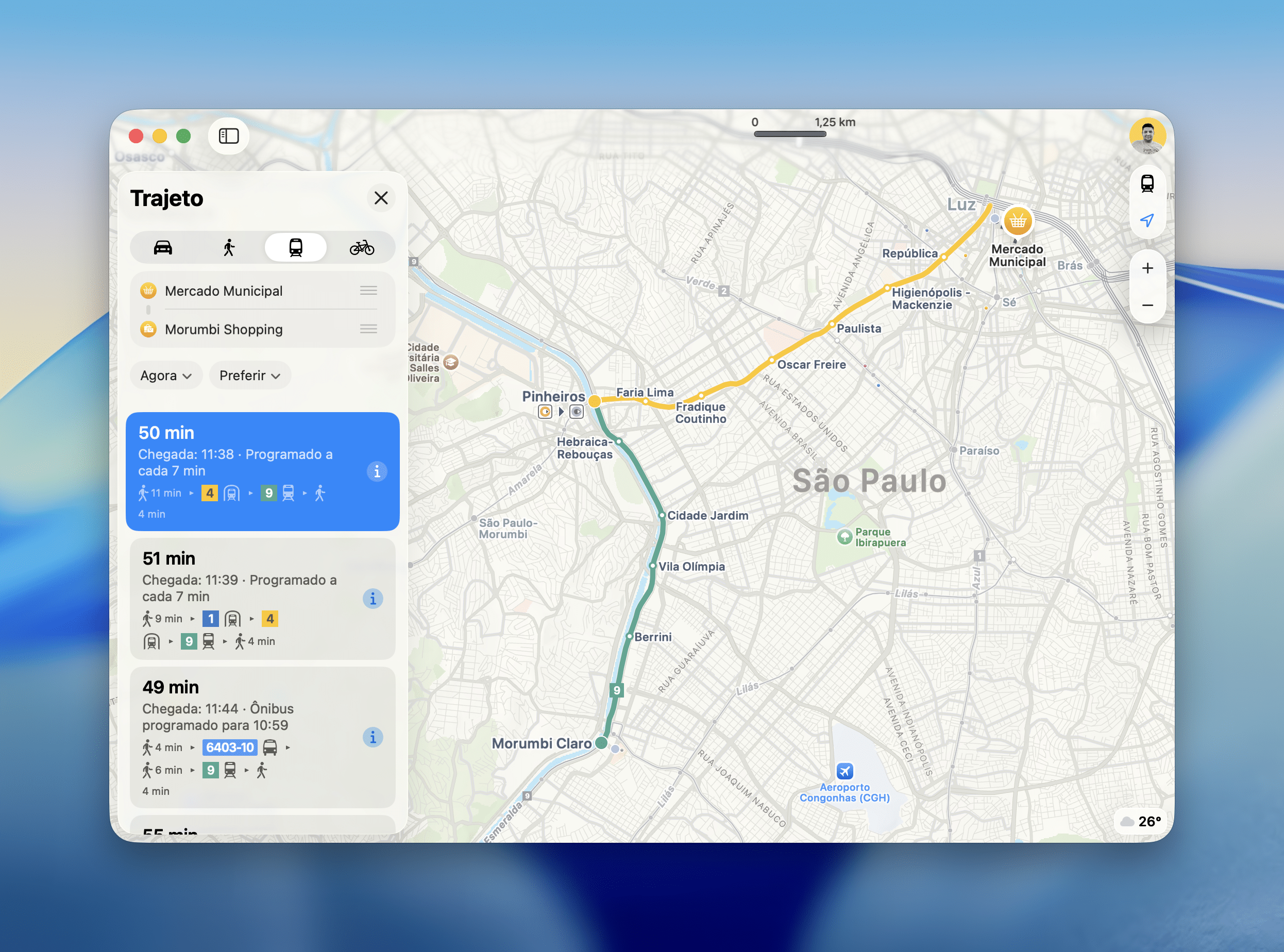 O aplicativo Mapas (Maps) da Apple possibilita, dentre outras coisas, que você obtenha itinerários de transporte público, que podem incluir os horários de saída, as informações de conexão e o valor da tarifa, por exemplo.
