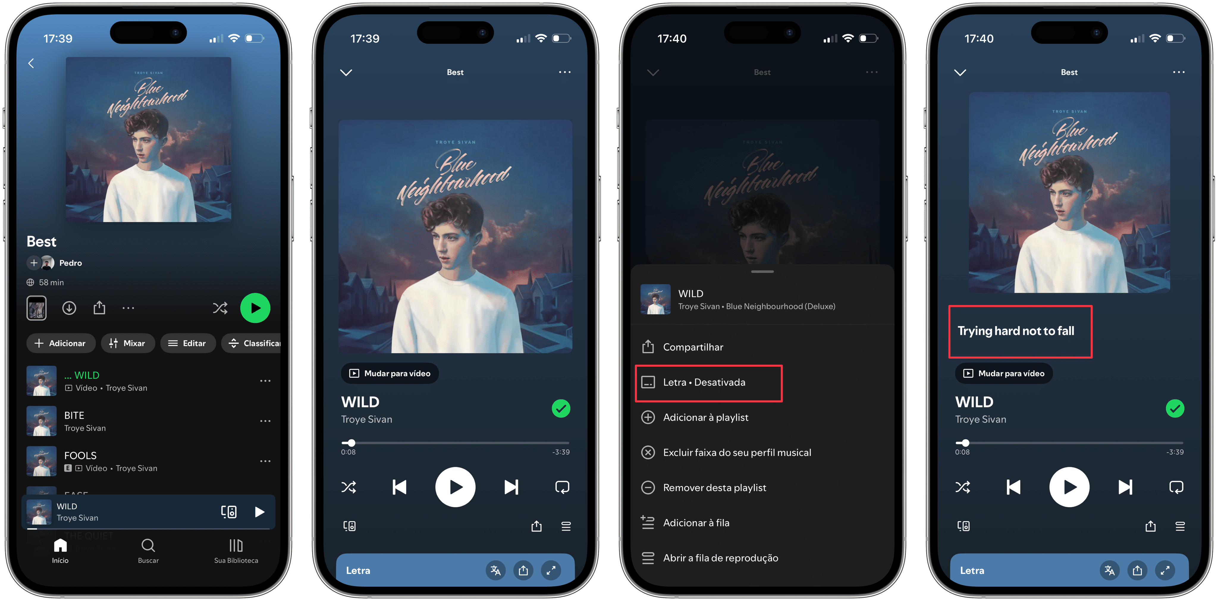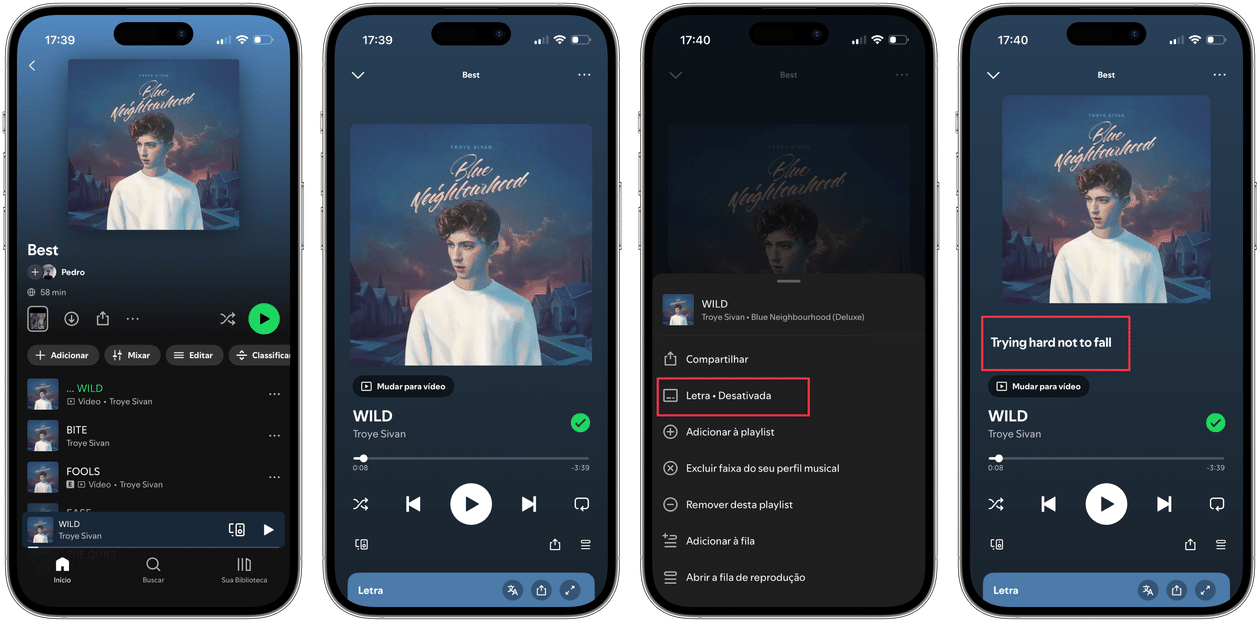 Selecione os três pontinhos (no canto superior direito) e habilite “Letra” para mostrá-la junto à capa do álbum.