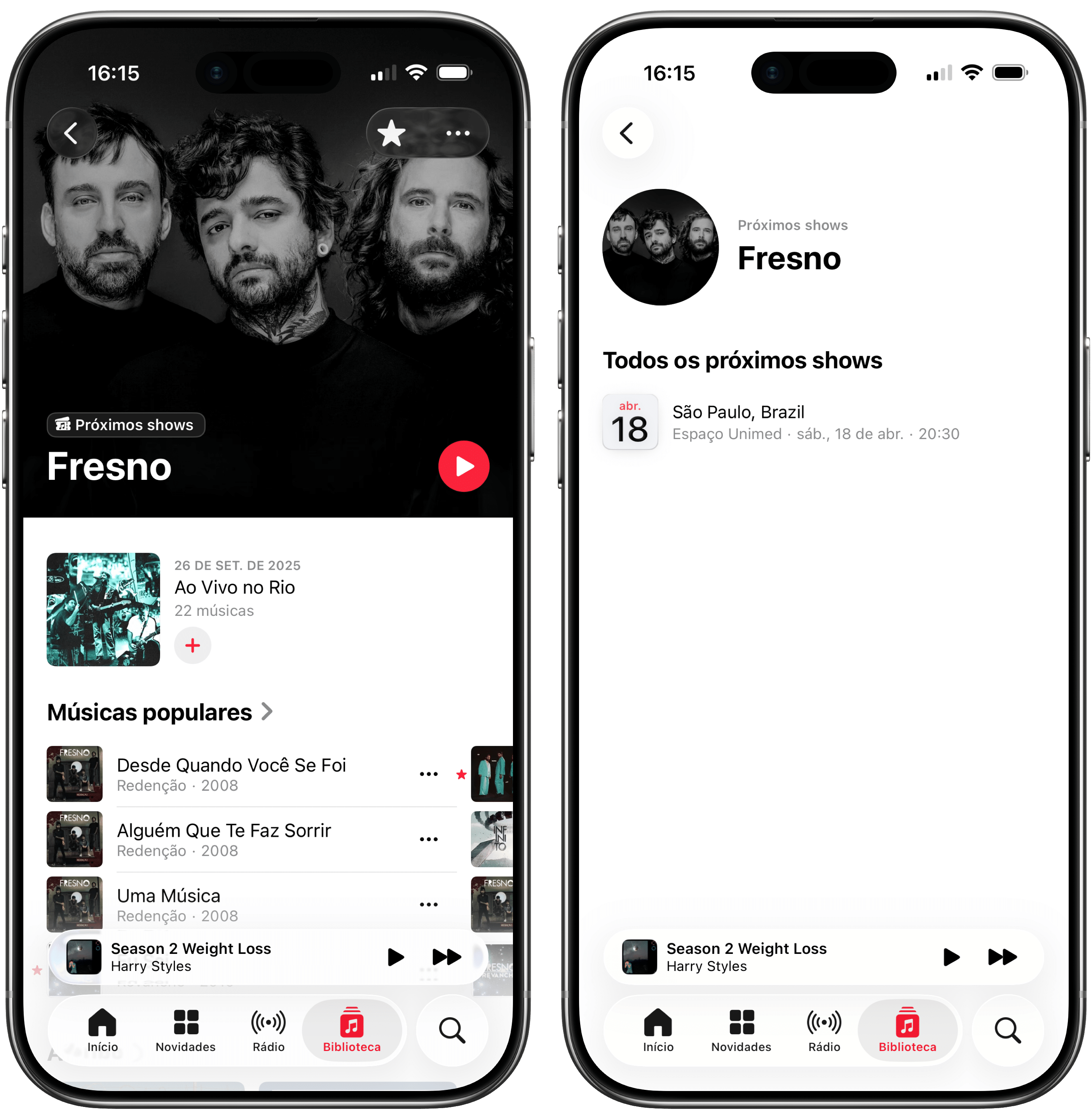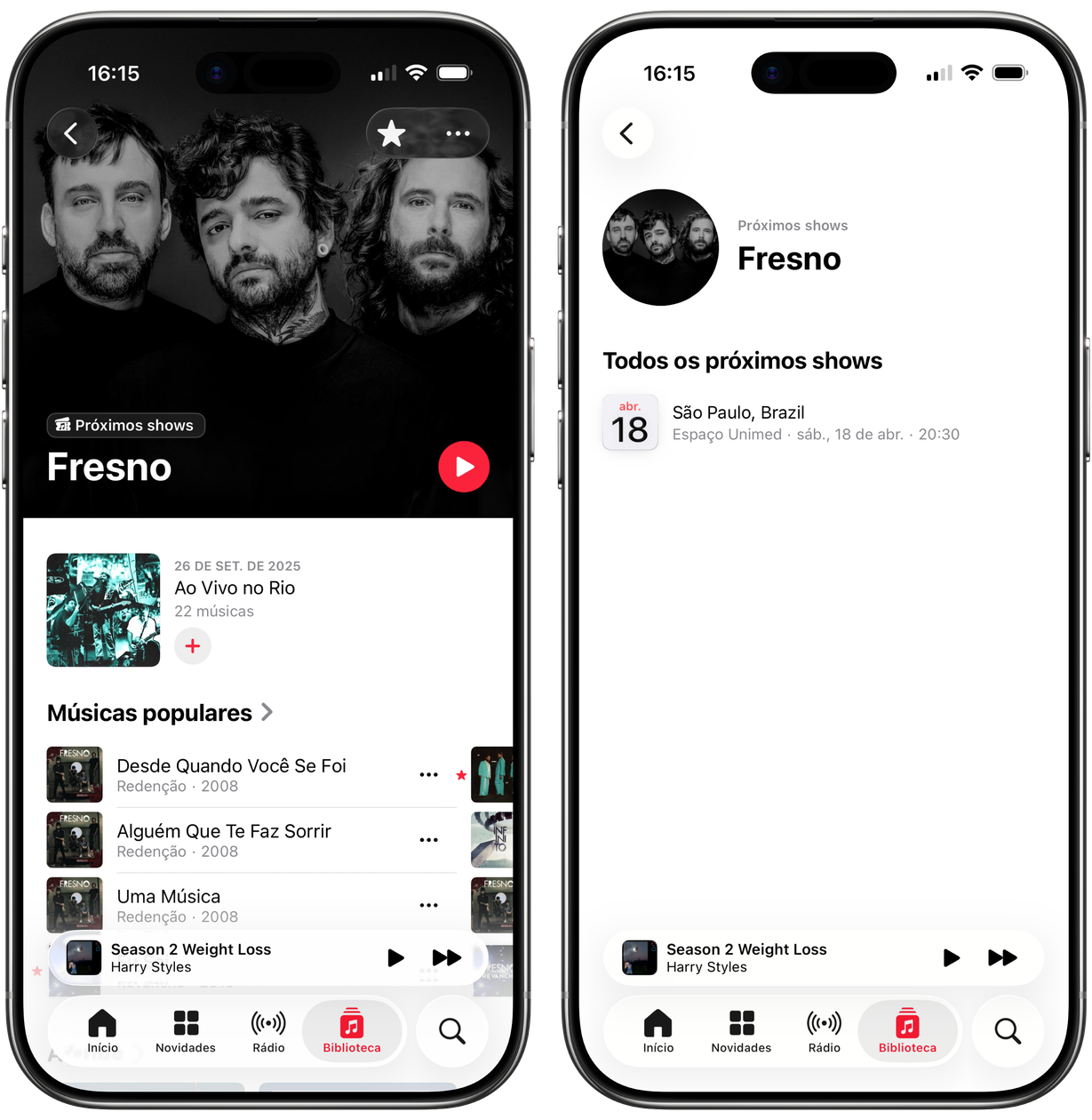 Com o app Música aberto, vá até a página de um artista e toque em “Próximos shows” (acima do nome dele) ou vá até a seção “Todos os próximos shows”.