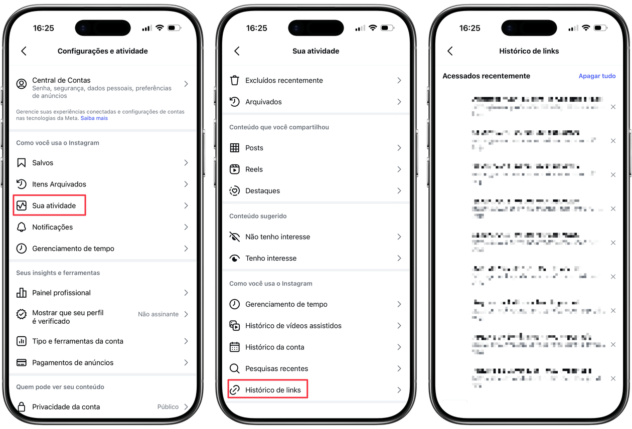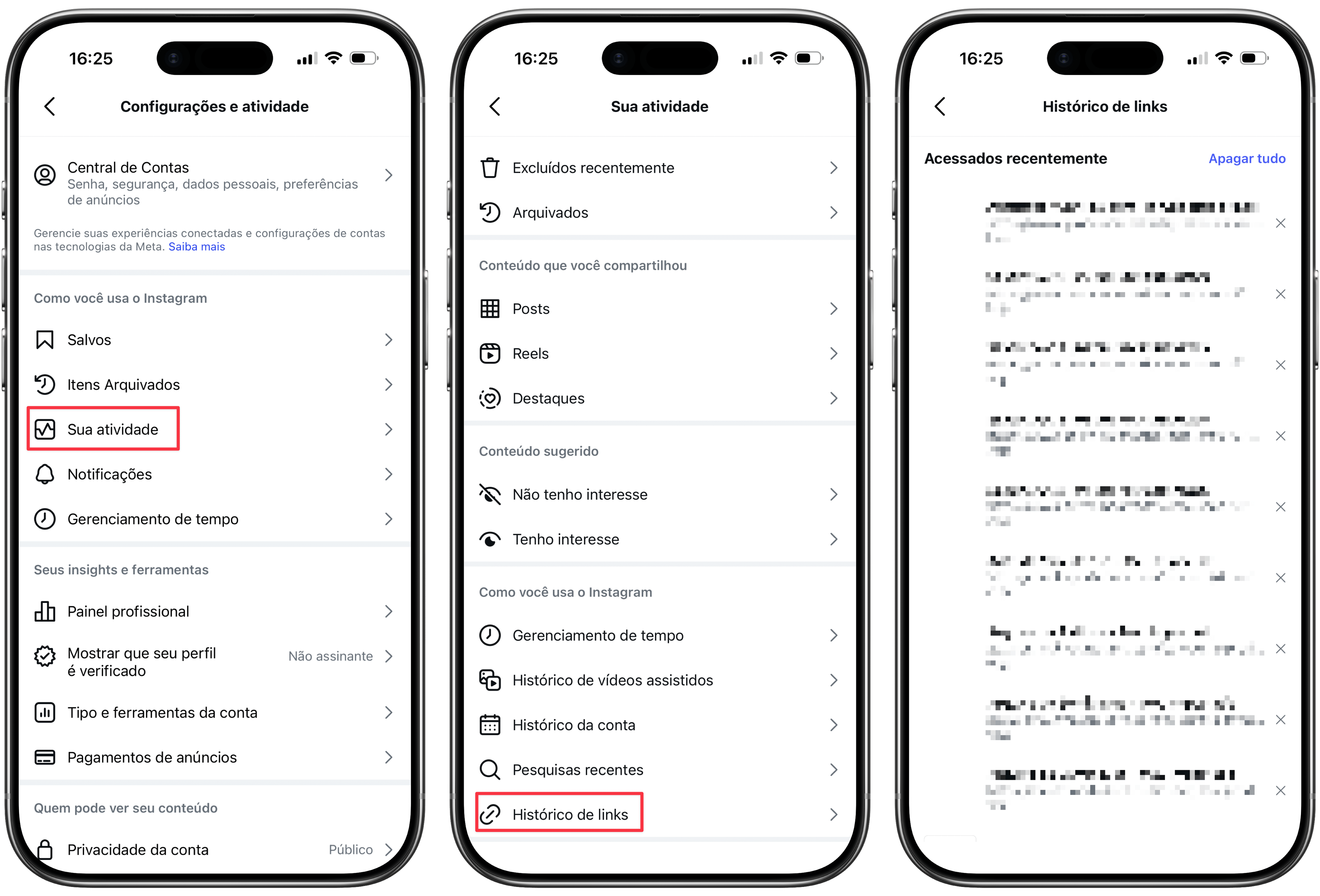Na seção “Como você usa o Instagram”, acesse “Sua atividade” e “Histórico de links” para ver todos os links acessados recentemente.