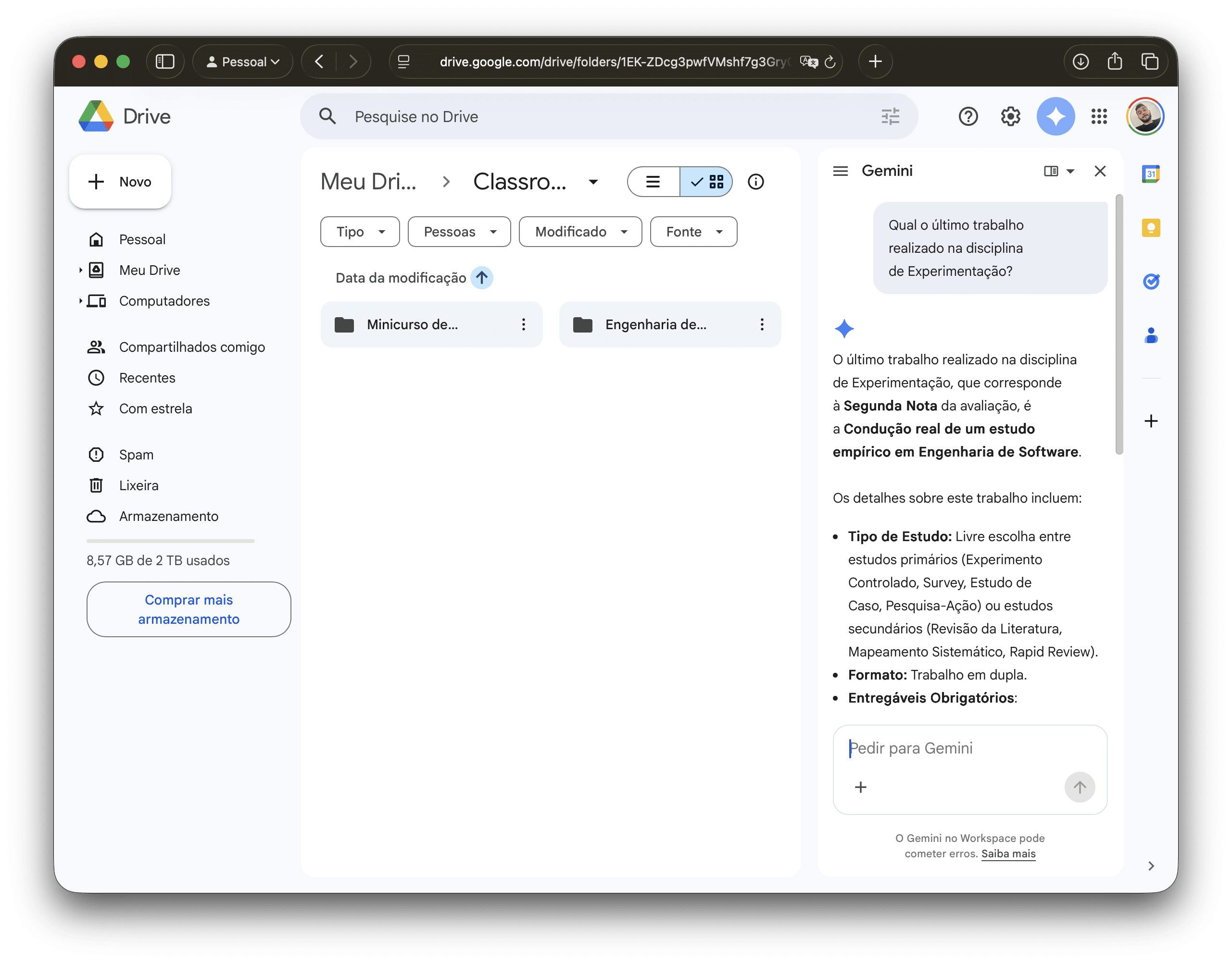 A partir dessa barra lateral, você pode perguntar ao Gemini sobre informações de texto presente em PDFs ou documentos, pedi-lo para resumir documentos longos ou o conteúdo de pastas inteiras, bem como localizar determinado arquivo ou dado usando um prompt temático.