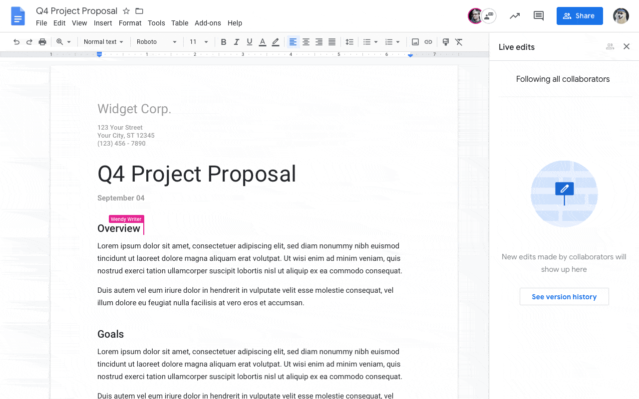 Além disso, como no caso supracitado do iCloud, vários usuários podem editar e colaborar simultaneamente em documentos, apresentações e planilhas do Google, com indicadores diferentes de digitação e um histórico bastante detalhado de edições.