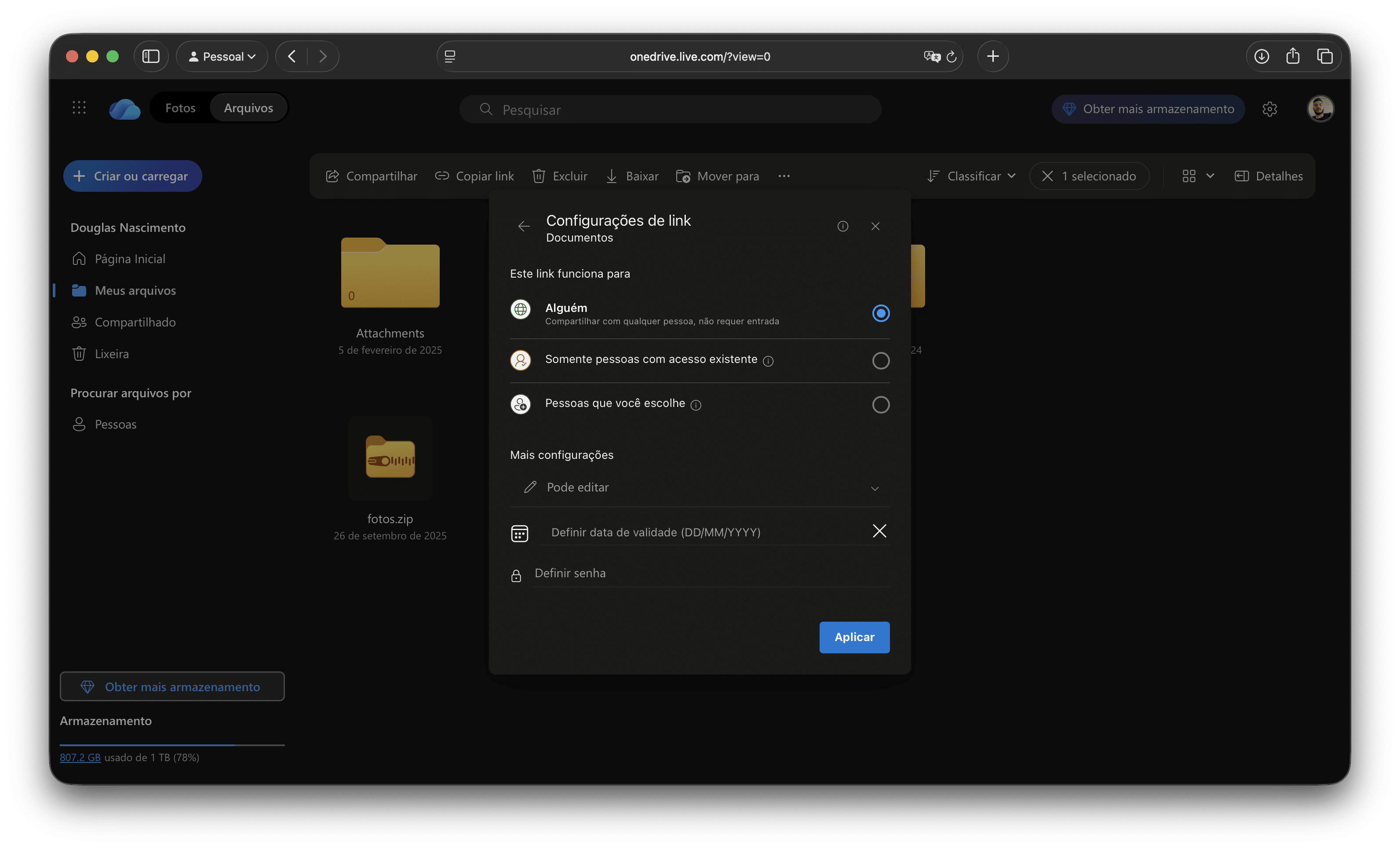 Seguindo o exemplo dos demais, o OneDrive também permite controlar o acesso a arquivos por meio de um link (que pode ser público, interno ou restrito), bem como compartilhá-los com contas específicas por meio de um convite via email.
