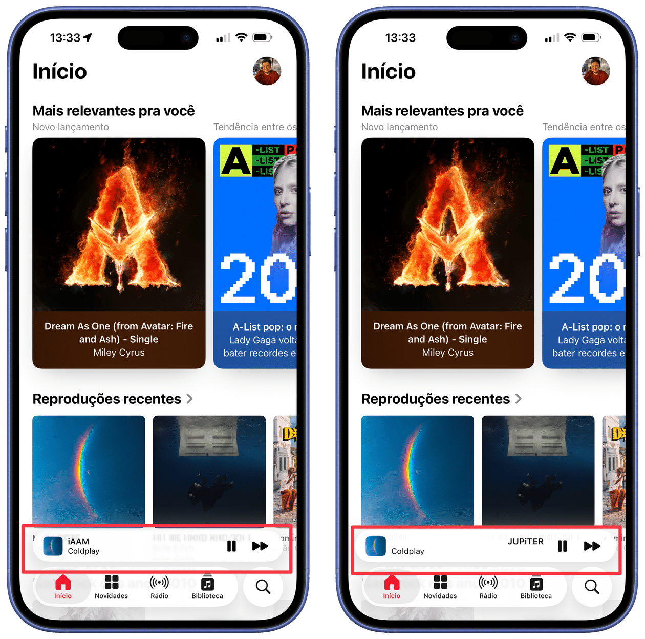 A partir do iOS 26.1, é possível avançar ou retroceder uma faixa sem precisar abrir a tela de reprodução em tela cheia.