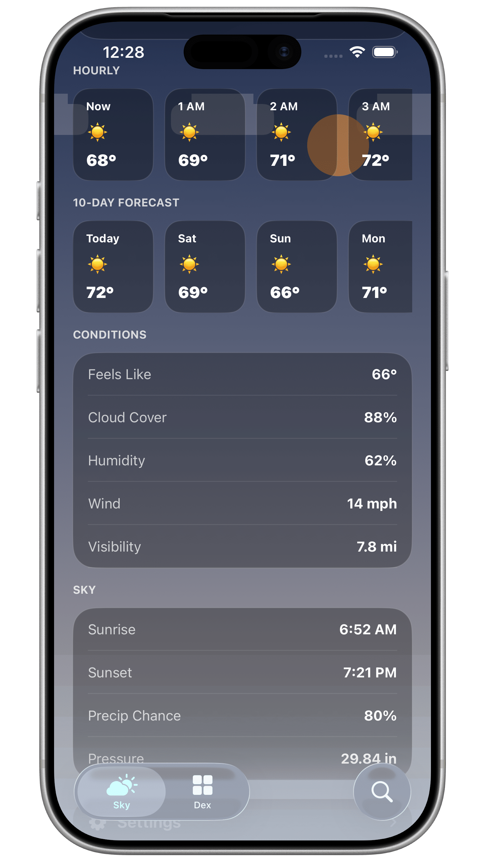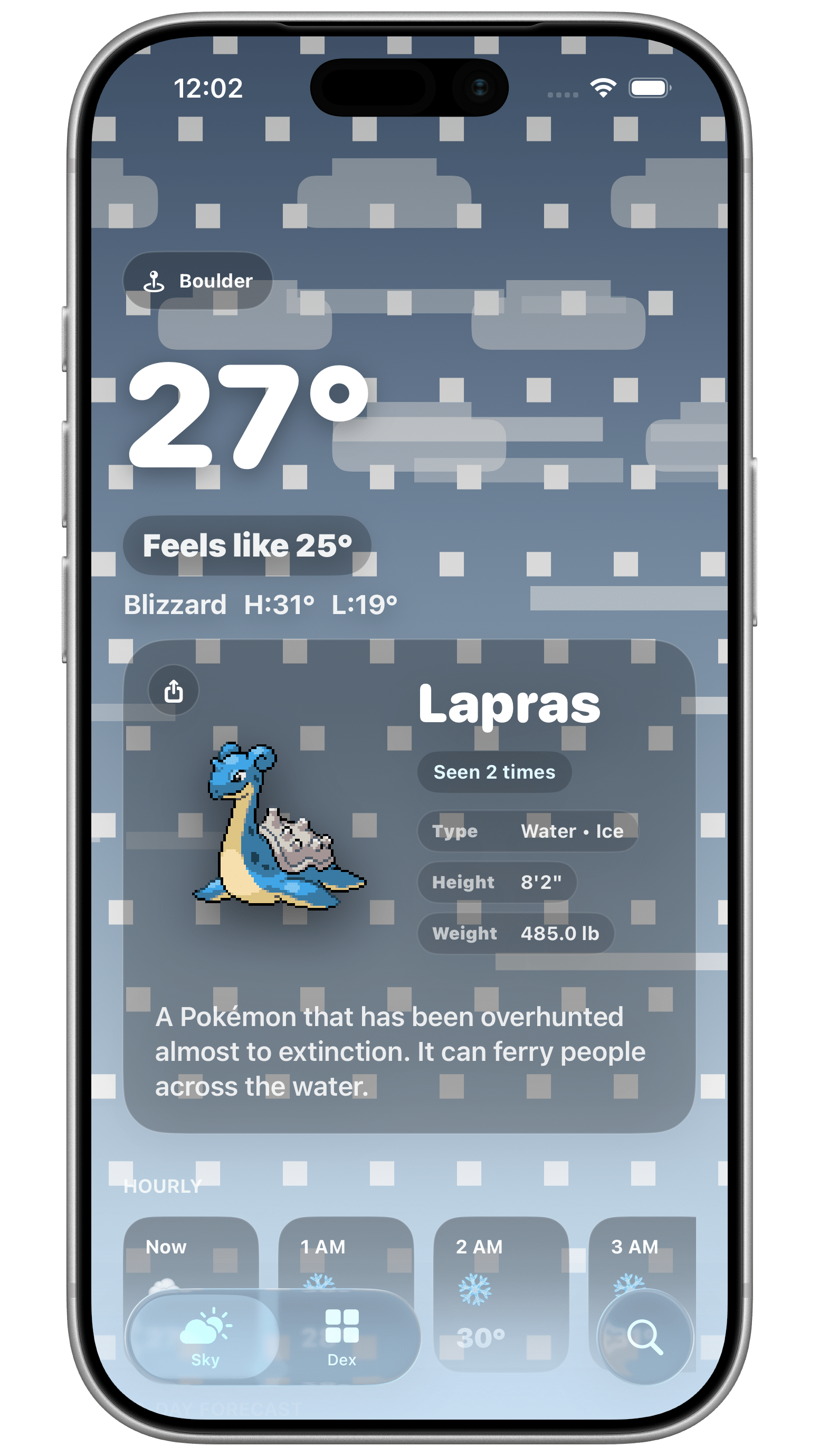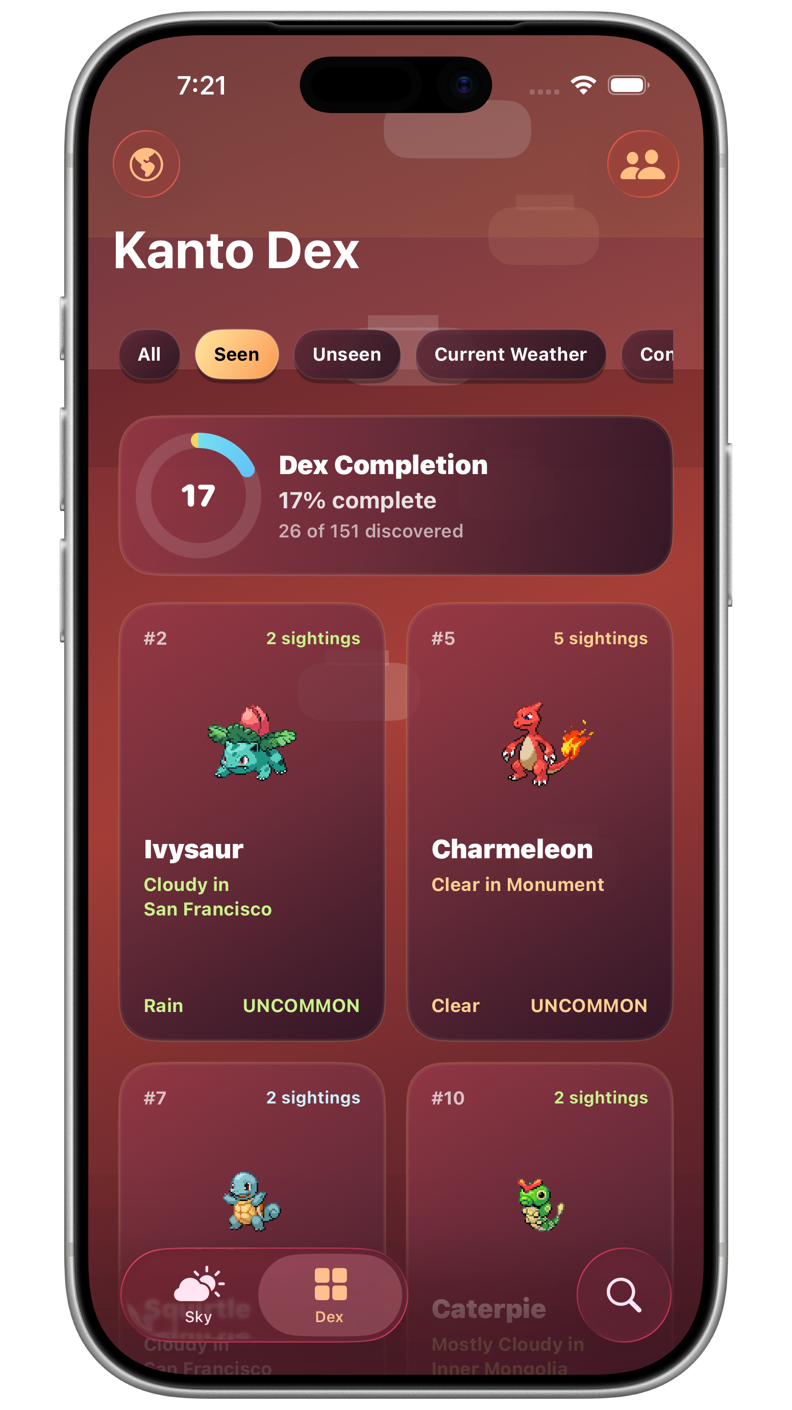 Como explicado por Fernando Silva, do 9to5Mac, caso o tempo esteja ensolarado, é possível que você se depare com um Meowth — ou algo mais raro como um Alakazam — ao abrir o SkyDex, por exemplo. Caso o Pokémon em questão seja completamente inédito para você, ele será adicionado à sua Pokédex, que também diz quantas vezes você encontrou cada Pokémon, além de fornecer informações gerais sobre eles.
