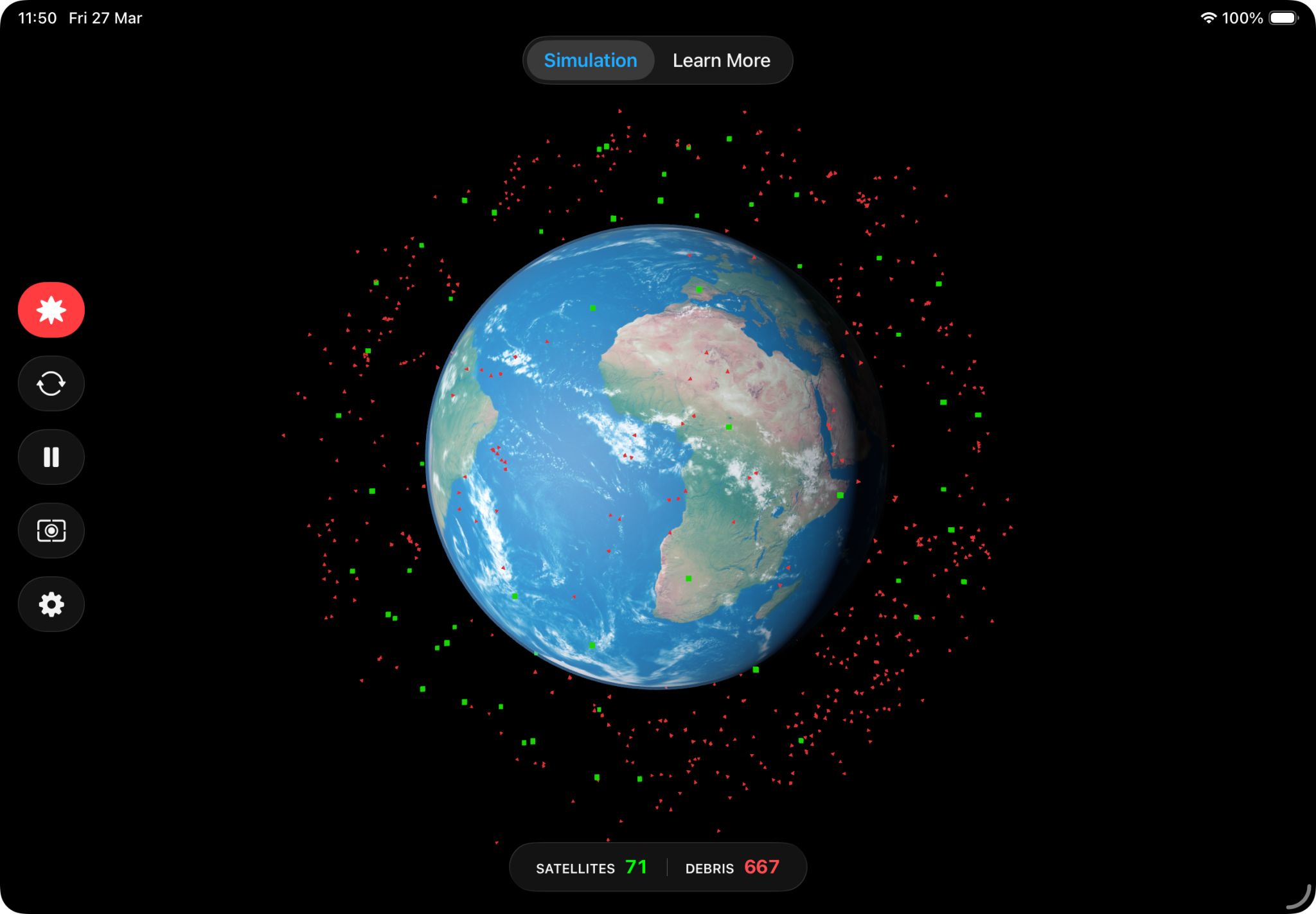 Completamente interativo, o app mostra uma visualização de colisões em cadeia de detritos espaciais e satélites, com física gravitacional construída usando RealityKit e o framework Accelerate.
