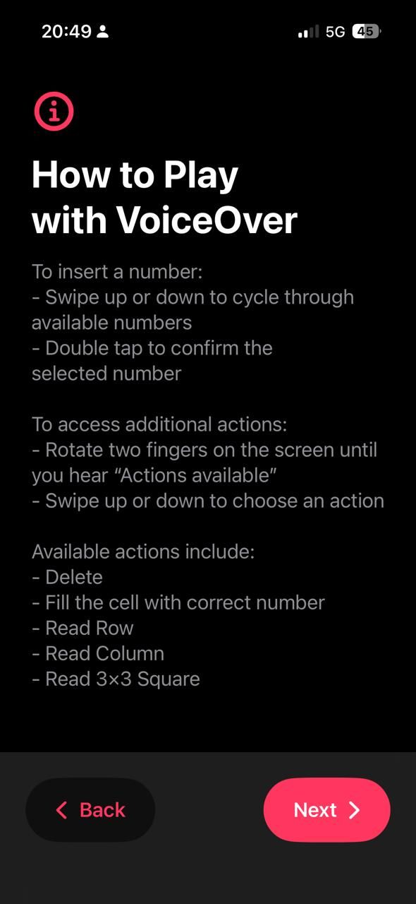 O game usa uma das ferramentas de acessibilidade mais populares da Apple, o VoiceOver, e permite que usuários naveguem pelo tabuleiro, insiram números e acompanhem o progresso da partida com gestos nativos e personalizados da ferramenta da Maçã.