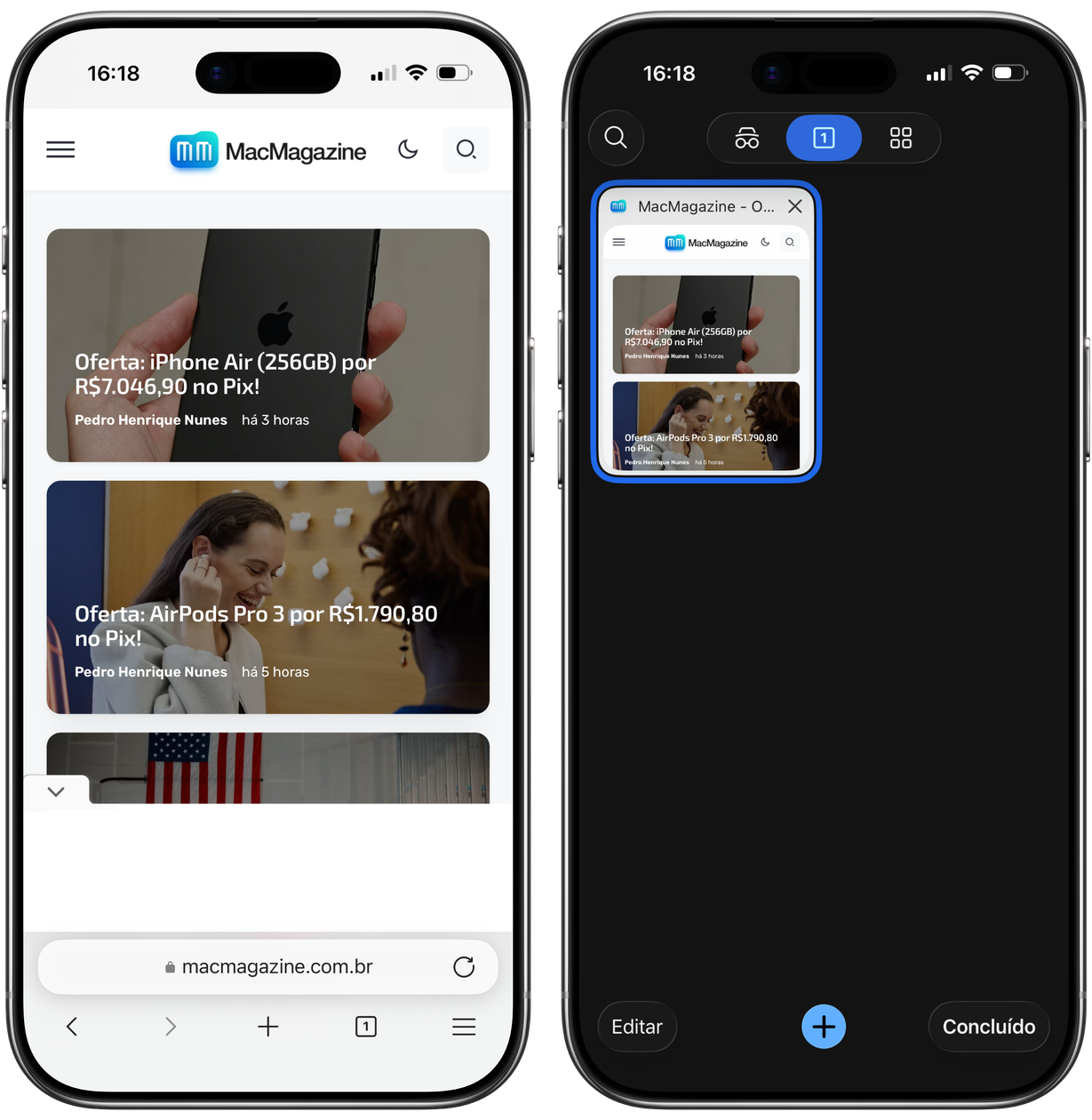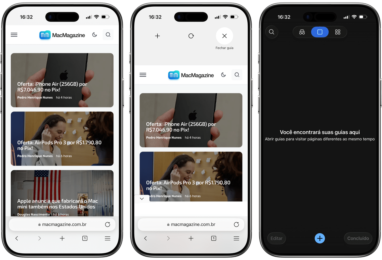Com uma guia aberta, toque no ícone com o número indicador de abas. Ao visualizar todas elas, selecione o “X” na prévia daquela que quiser fechar.