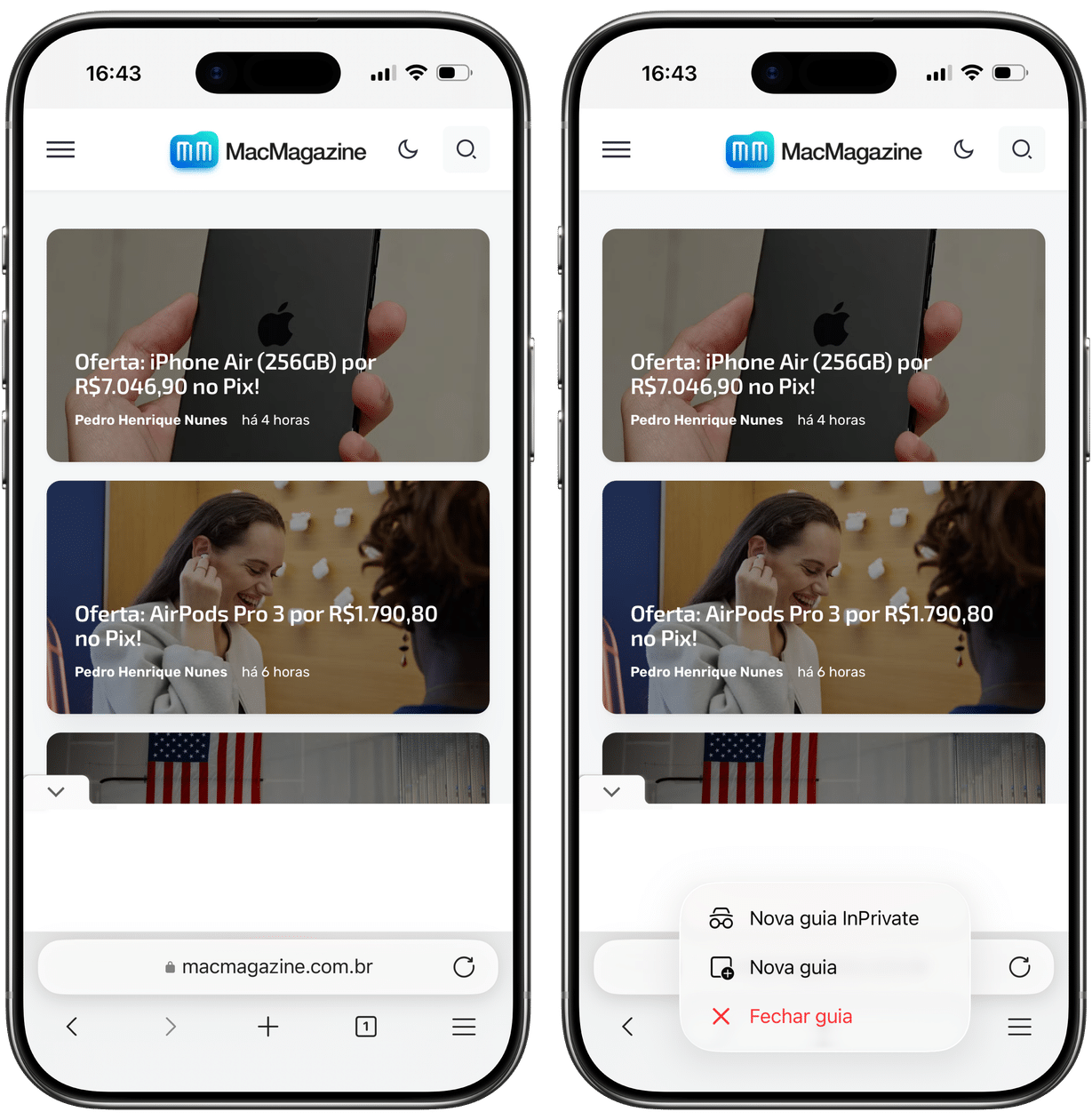 Mantenha o dedo pressionado em cima do indicador de abas abertas (na parte inferior da tela) até que o menu contextual apareça.