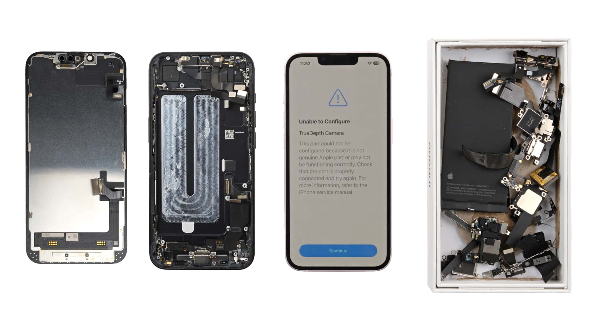 Quase todas as peças internas podem ser trocadas entre os aparelhos das duas gerações (até mesmo a placa lógica). A grande exceção é o Face ID, que é desativado quando a câmera frontal é trocada.