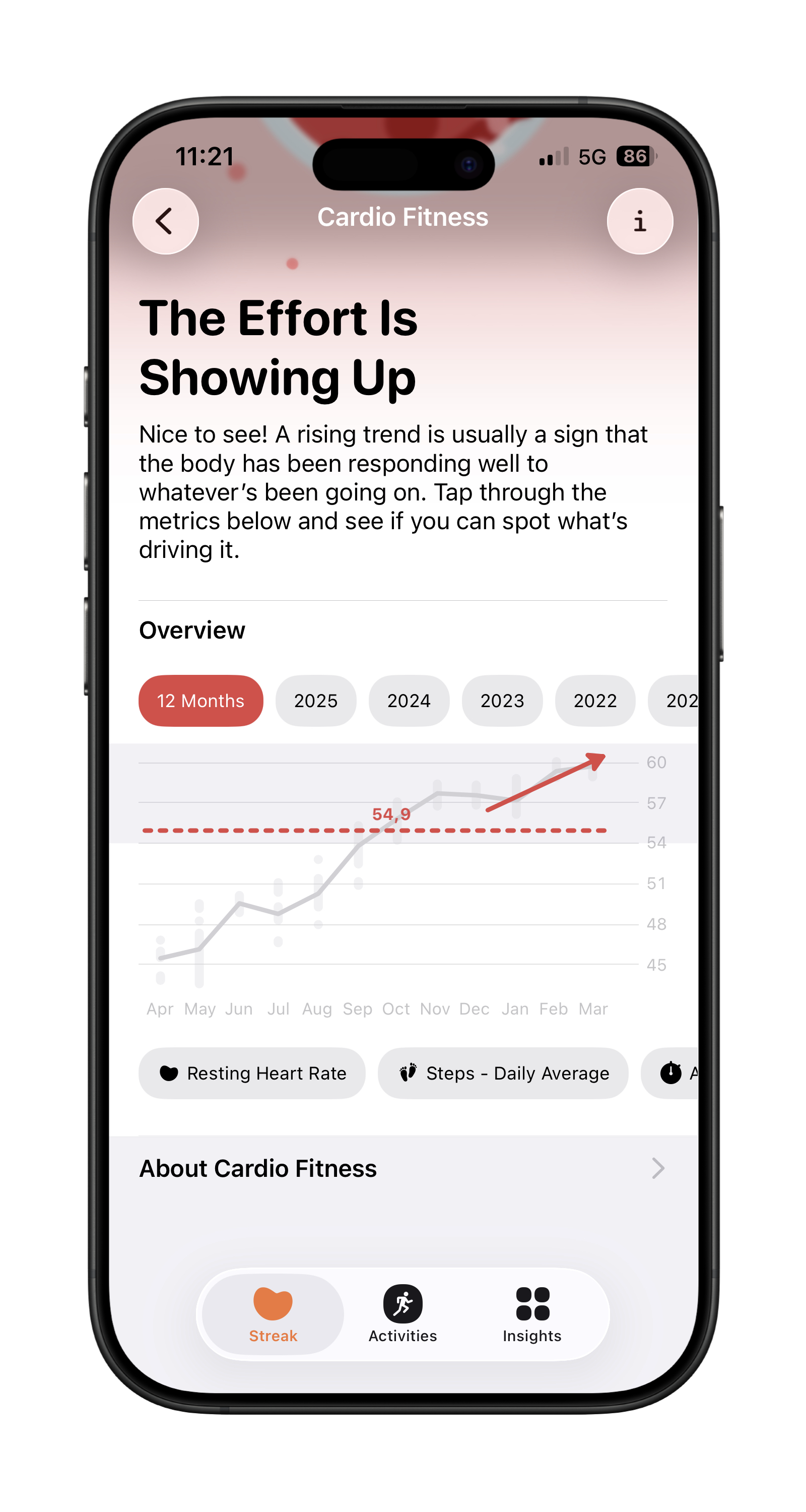 A aptidão cardíaca pode ser acompanhada dentro da seção Bem-estar, da aba Streak do aplicativo, junto com as demais métricas de saúde, através de um card gráfico que, quando tocado, apresentará o estado de tendência da métrica (aumentando, estável ou diminuindo) contextualizado, além de médias mensais a partir de um período de análise total anual.