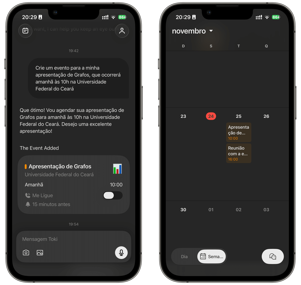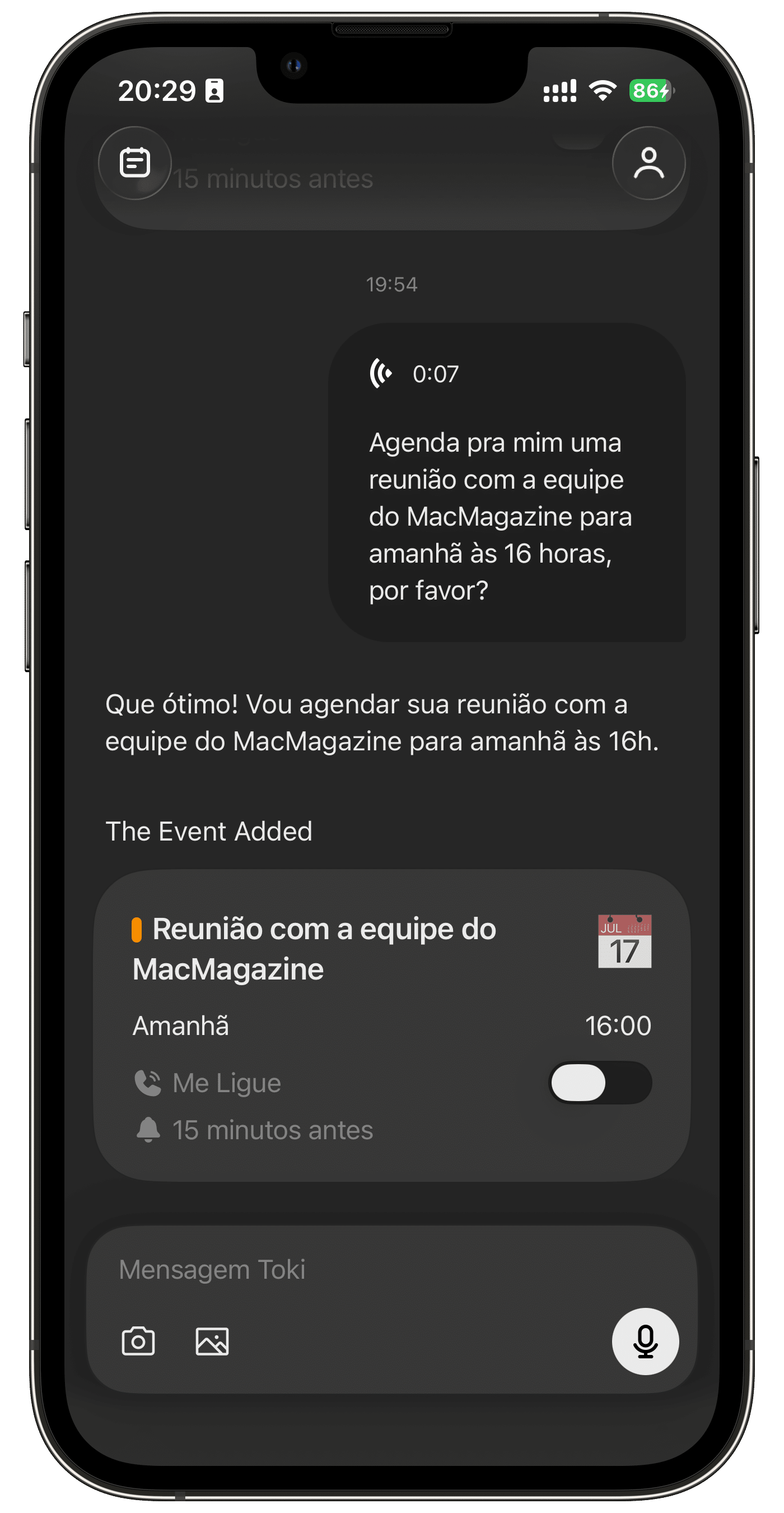 Esse não é o caso da Toki. Ainda que não conte com uma integração forte com os assistentes nativos dos sistemas, ele suporta o envio de áudios com linguagem natural e usa os seus algoritmos de IA para entender a tarefa e defini-la conforme o desejo do usuário.