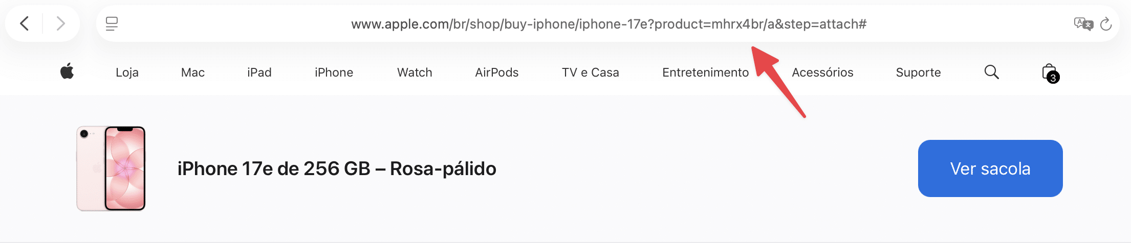 A primeira é pela página de compra da Apple Store Online brasileira, que já mostra o código MHRX4BR/A (no caso do modelo na cor rosa-pálido, por exemplo) na URL ao colocar o produto no carrinho.