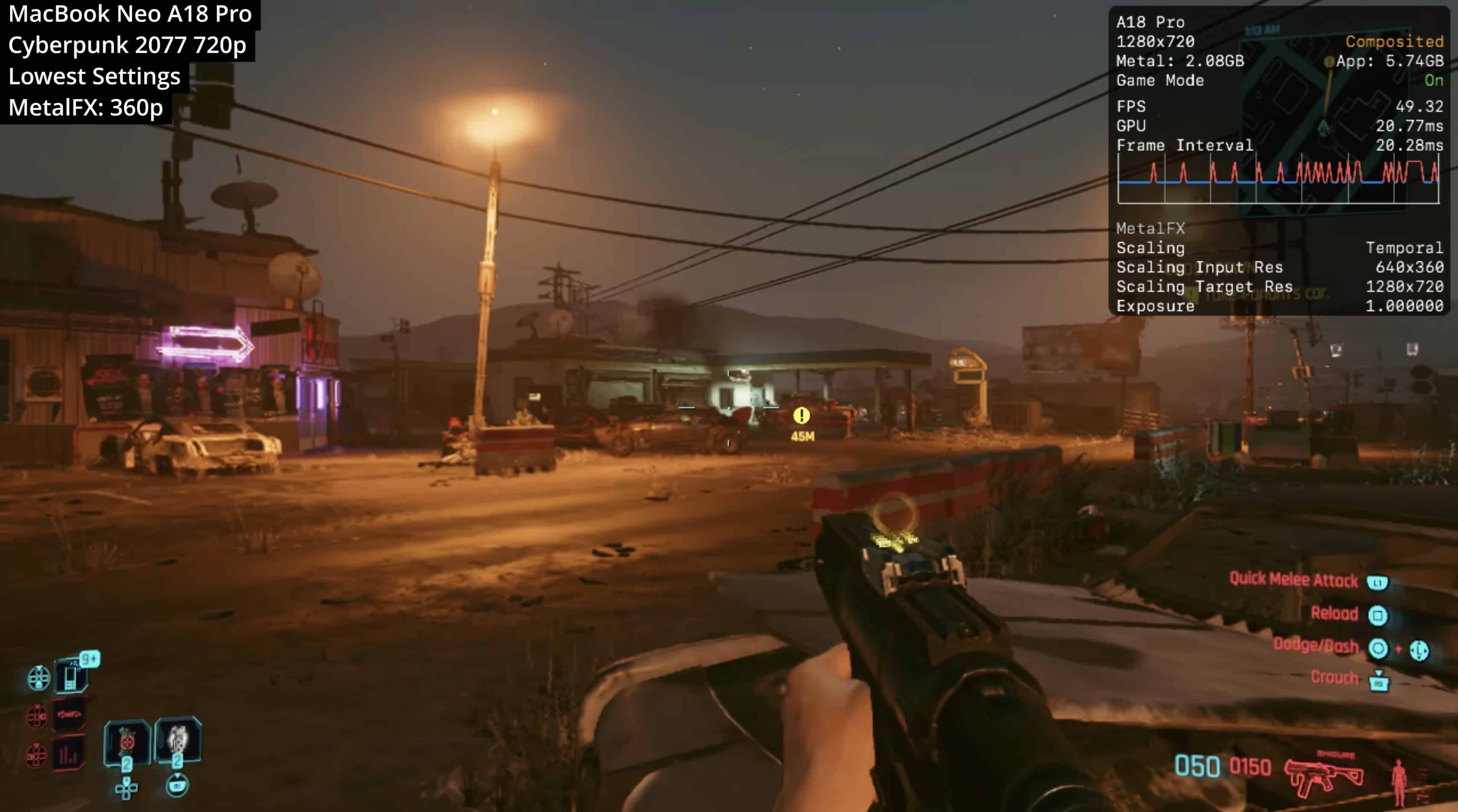 Com o jogo rodando em 720p e nas configurações gráficas mais baixas possíveis, o MacBook Neo foi capaz de atingir taxas de quadros na casa dos 45-55qps, com eventuais quedas para a casa dos 30qps e raros picos acima de 60qps, o que é no mínimo respeitável.