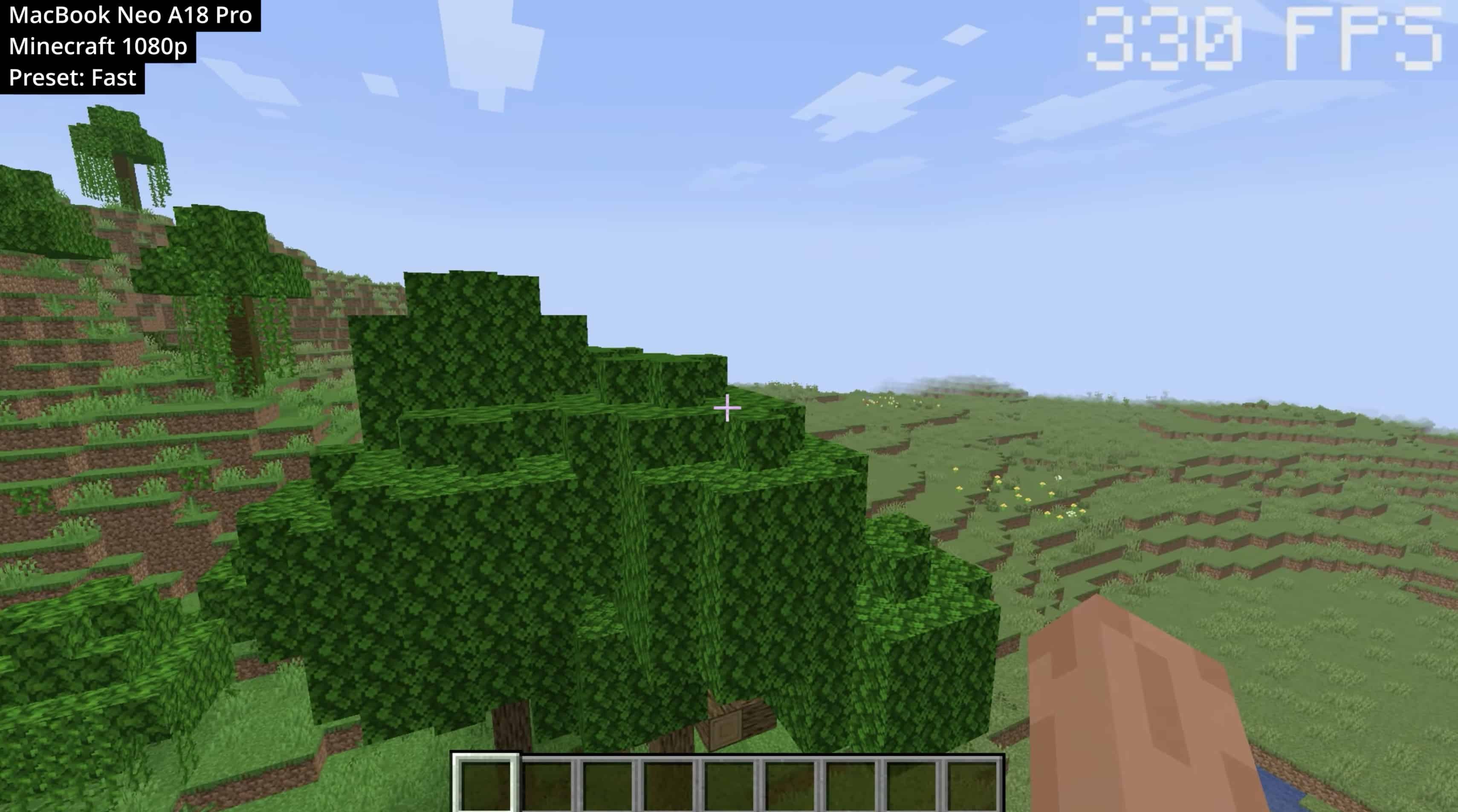 Tsai também colocou o MacBook Neo para rodar Minecraft: Java Edition e ele, como era de se esperar, se saiu muitíssimo bem, passando da marca dos 300qps com o preset gráfico rápido selecionado (em 1080p).