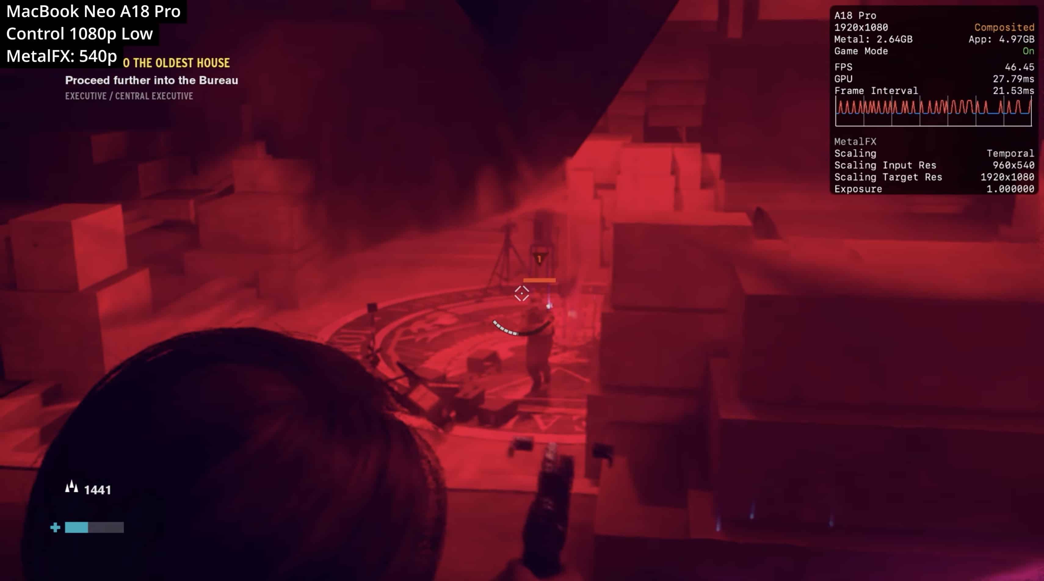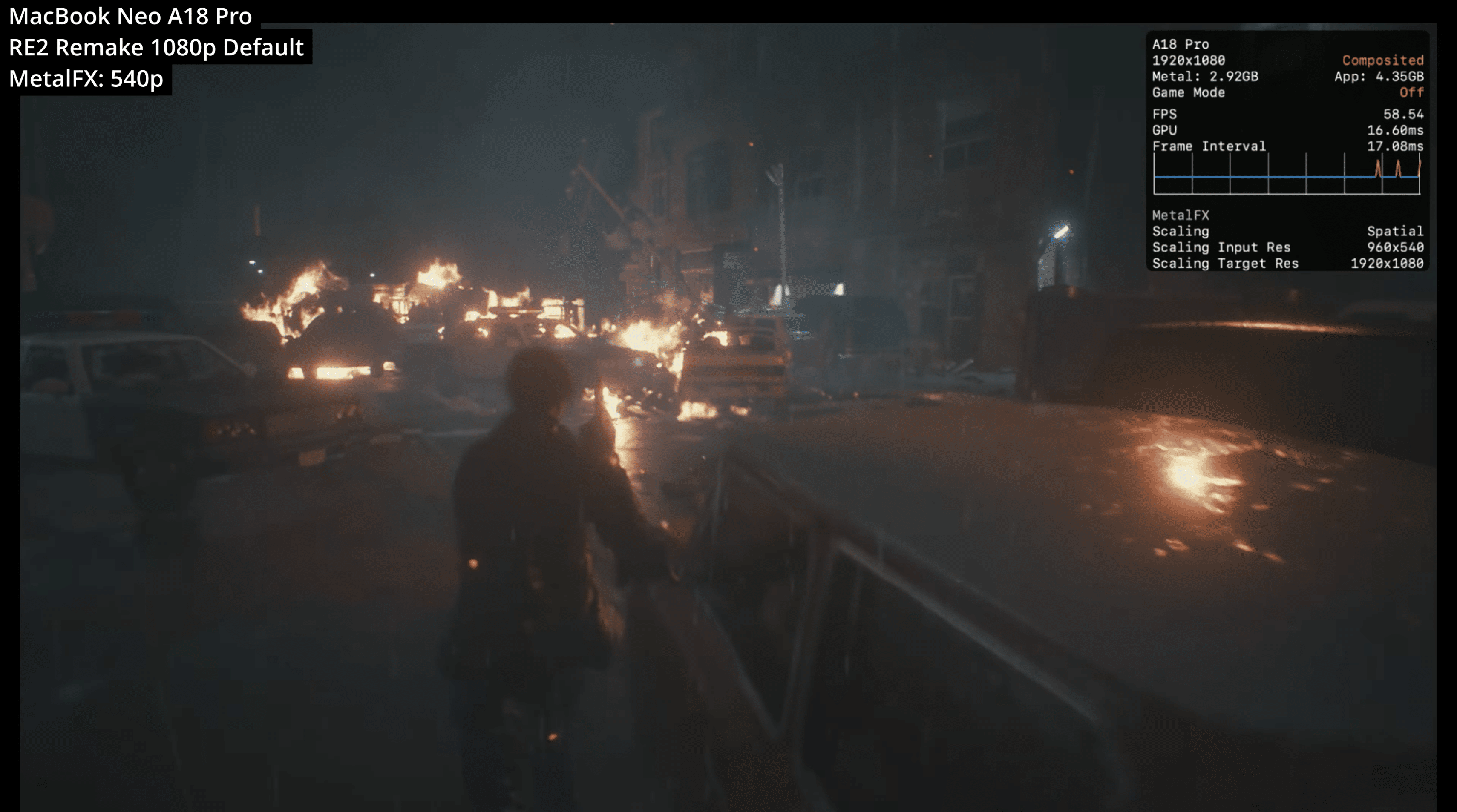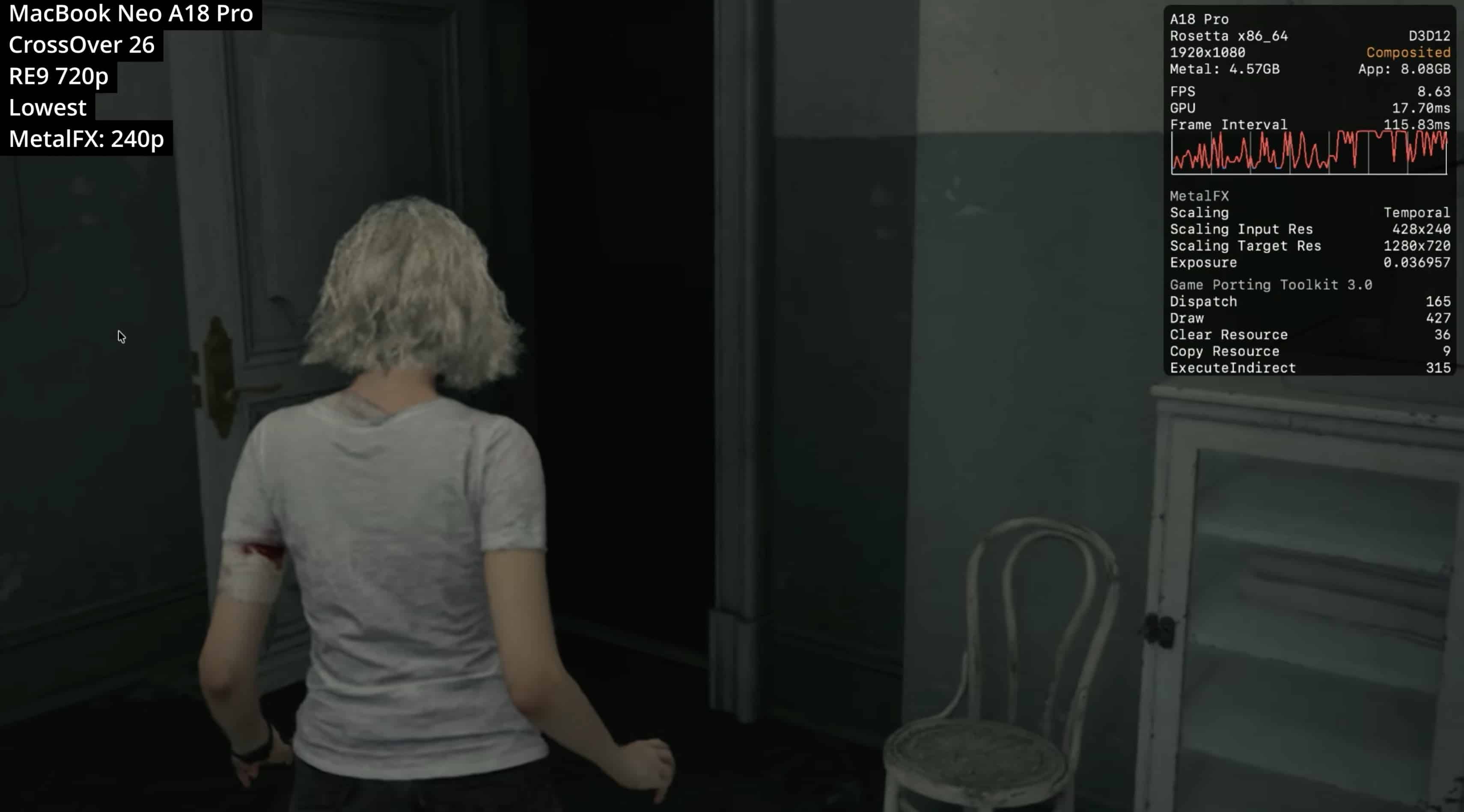 O primeiro desses títulos foi o recém-lançado Resident Evil Requiem, que se provou pesado demais para o MacBook Neo. Em 720p, o jogo alcançou uma média de 15qps, o que está longe de ser o ideal. Os 8GB de memória também provocaram gargalos, tornando esse título praticamente impossível de jogar no novo laptop.