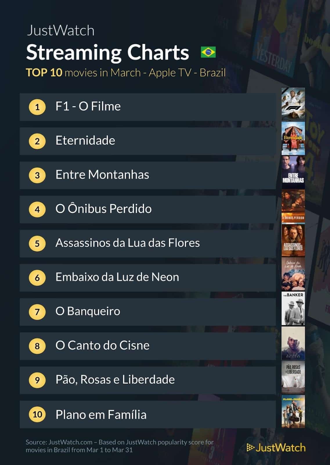 Agora com uma vitória no Oscar, “F1 — O Filme” (“F1 The Movie”) continuou na liderança entre as produções cinematográficas mais vistas do catálogo do Apple TV no mês de março.