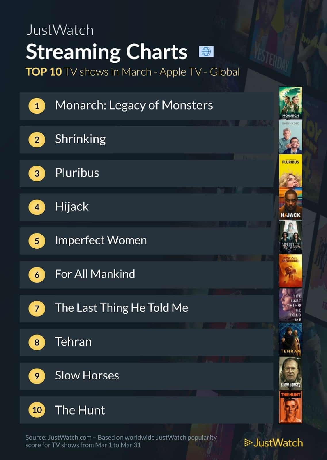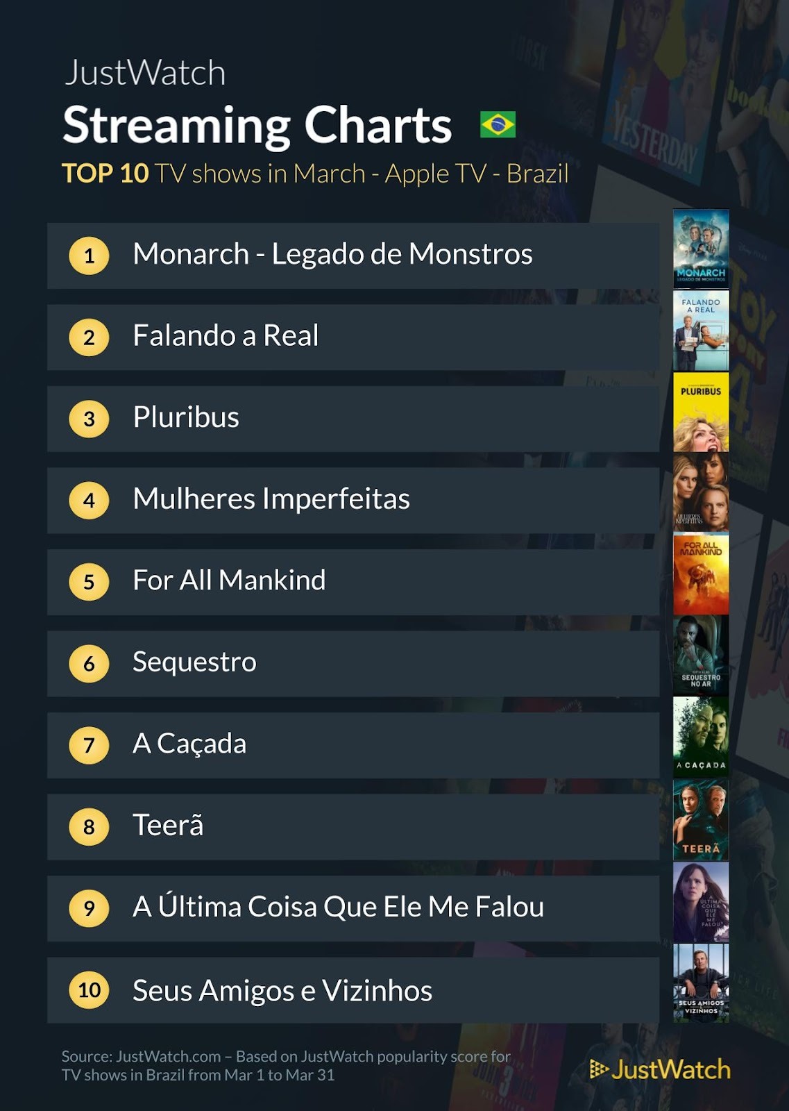 Sem grandes surpresas, a liderança no Brasil e no mundo não demonstrou divergências; a novidade é a presença da série integrante do MonsterVerse, “Monarch: Legado de Monstros” (“Monarch: Legacy of Monsters”) — cuja estreia da segunda temporada ocorreu no final de fevereiro e novos episódios serão disponibilizados toda sexta-feira, até 1º de maio.