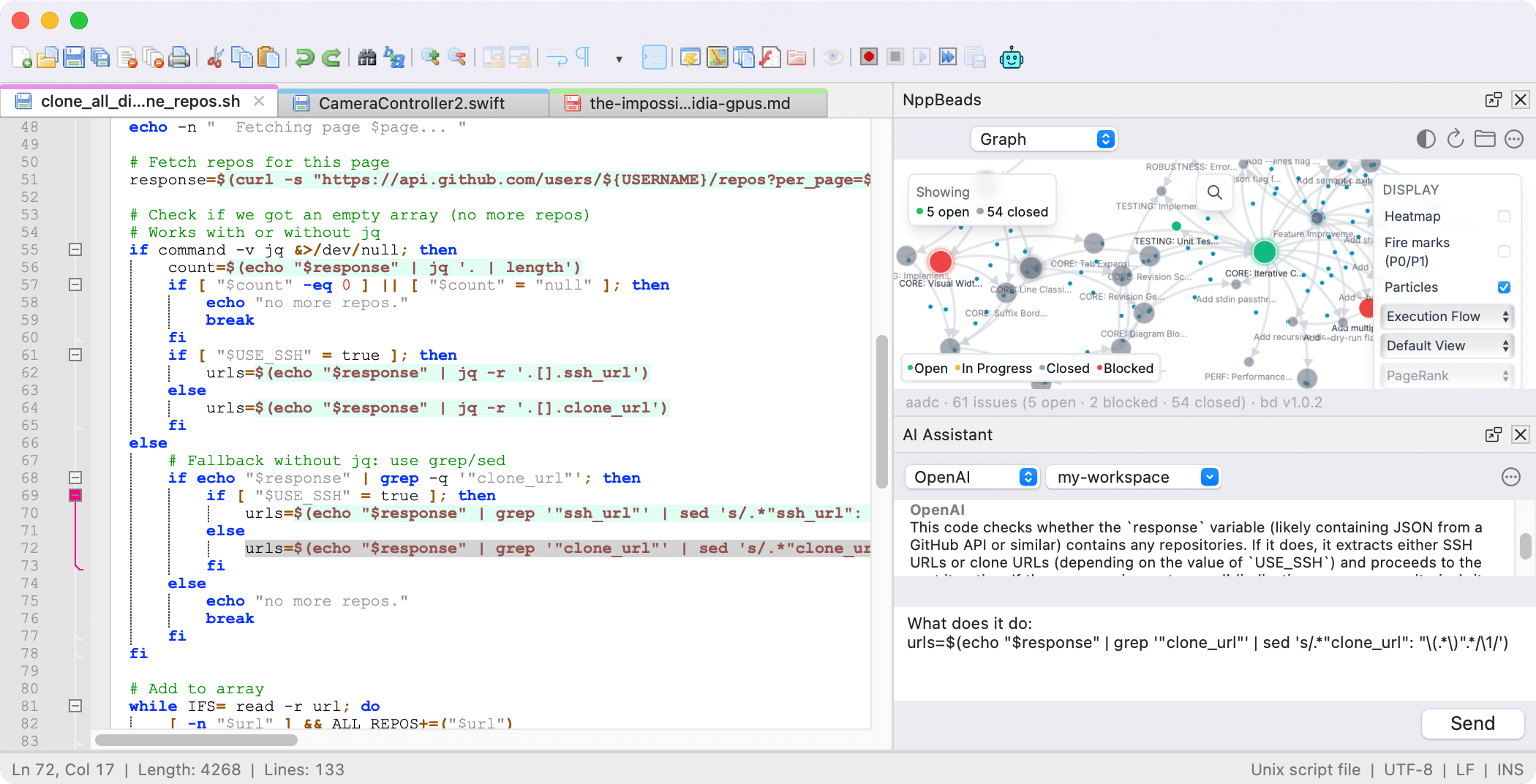 O Notepad++ oferece paridade completa de recursos — realce de sintaxe, plugins, macros, busca em arquivos, expressões regulares, visualização dividida, mapa de documentos e muito mais. No caso dos plugins, eles estão sendo portados gradualmente do Windows, sendo que cerca de 50 opções já estão funcionando no macOS.